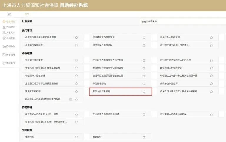 登录“上海市人力资源和社会保障自助经办系统”(网址:https://zzjb.rsj.sh.gov.cn),点击左侧【社会保险】,在右侧的“参保缴费”栏目下方,找到“单位人员信息查询”事项;