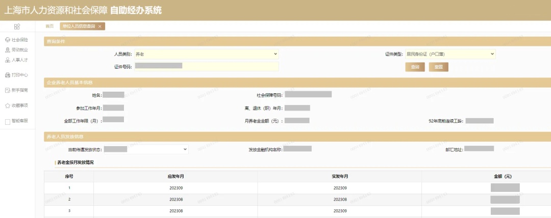 若是养老人员,可查询企业养老人员基本信息、养老人员发放信息(如养老金按月发放情况、增资信息等)。