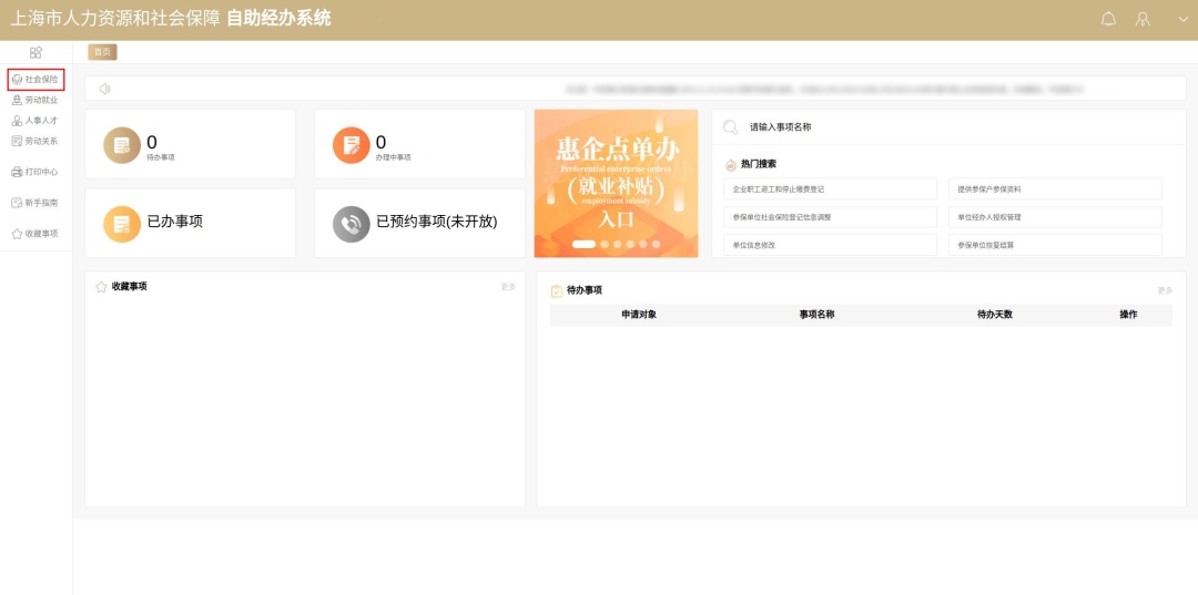 登录“上海市人力资源和社会保障自助经办系统”(网址:https://zzjb.rsj.sh.gov.cn),点击左侧【社会保险】;