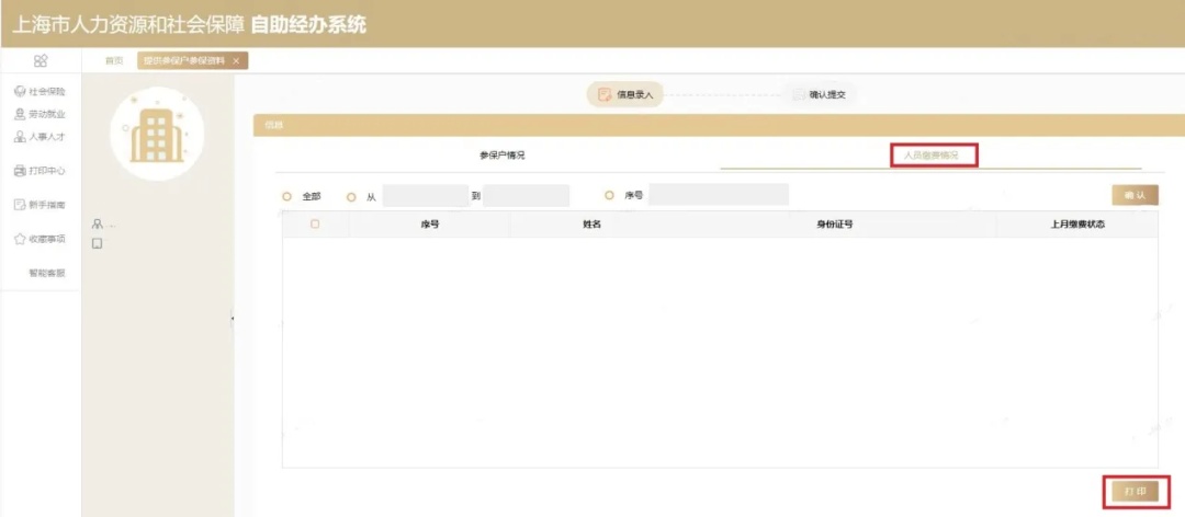 选择“人员缴费情况”,确认人员范围后,点击“打印”,即可获取《单位职工参加城镇基本养老保险情况》。