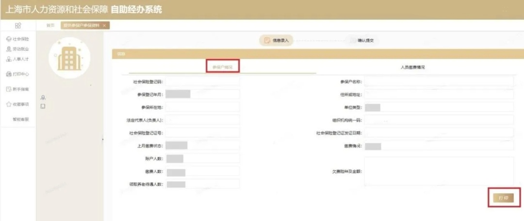 选择“参保户情况”,点击“打印”即可获取《单位参加城镇社会保险基本情况》;