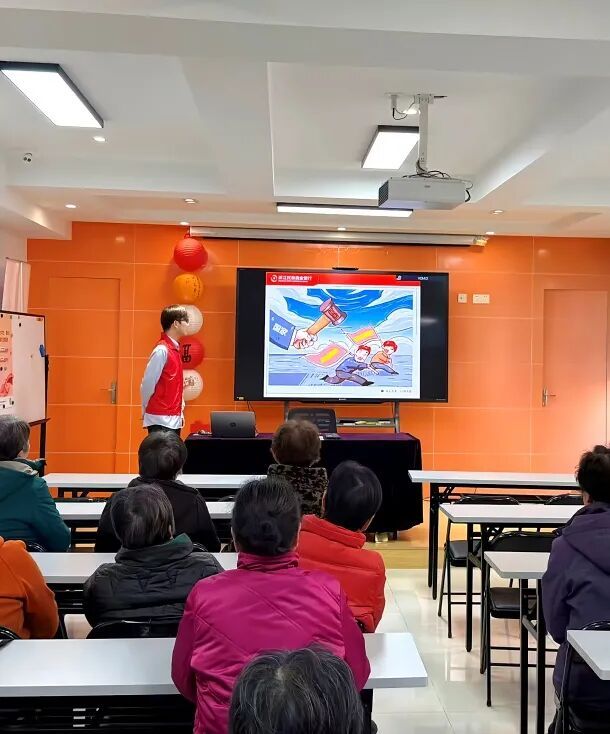 松江支行深入社区,将反诈宣传嵌入老年集体生日会。用通俗易懂的语言,结合典型案例揭露“养老理财”“以房养老”等骗局,让老年人在欢乐互动中巩固防骗知识。并且组织“清廉金融志愿服务队”进入社区,开设便民大讲堂。志愿者结合“新年理财福利”等常见诱饵,通过卡通课件、真实案件向居民拆解诈骗手段,强调“天上不会掉馅饼”,帮助居民树立理性投资观念。
