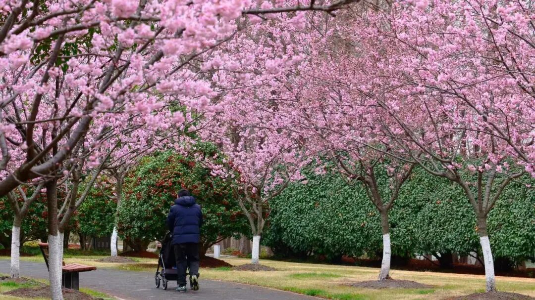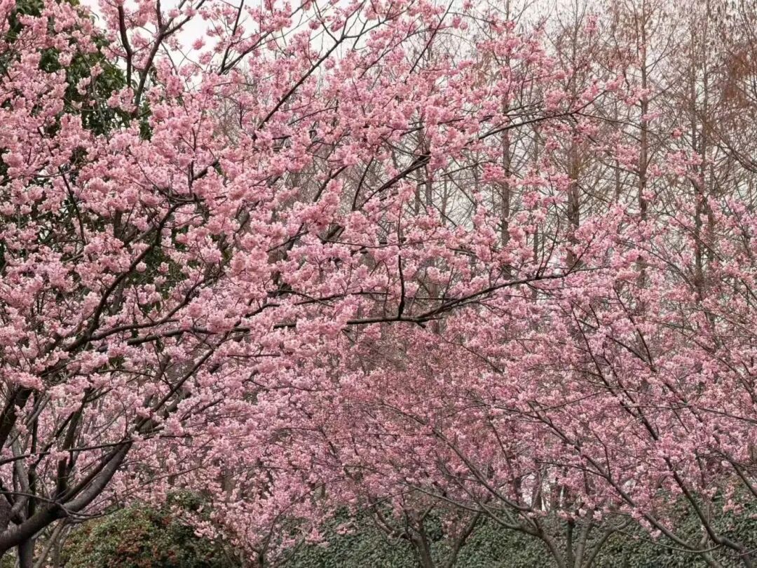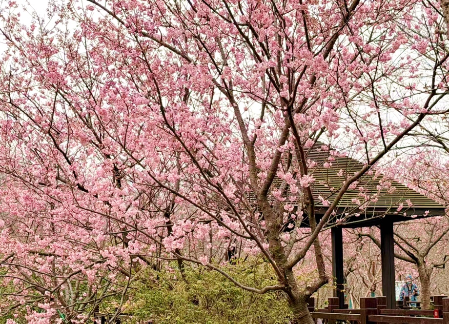 目前,公园1号门附近的樱花林已成为观赏早樱的热门打卡点。在木栈道和樱来亭周围,河津樱与椿寒樱已进入盛花期,花朵层层叠叠,宛若一片浪漫的粉色花海。