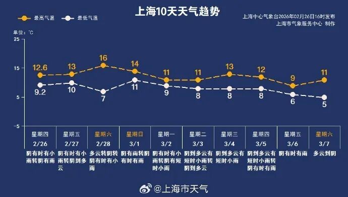 周六上班日,夜间雨水重启。3月上旬活跃的暖湿气流继续发力,上海阴雨天气频繁现身,阳光的存在感很弱,整体偏潮湿。本周日前后的降水会相对明显一些,元宵节夜里有望转阴到多云,但云量总体偏多。气温起伏不大,最高气温11~16℃,最低气温7~11℃。下周五前后,随着一股冷空气影响,降雨再度明显,气温也会随之下滑至个位数。近期大家雨具记得常备,及时关注最新天气信息。