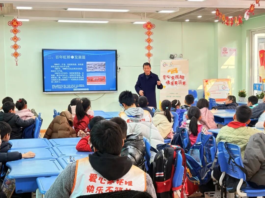 在程家桥街道,街道关工委将百年虹桥史讲座带进爱心寒托班。为将本土历史化为红色教育的“活教材”,在《百年虹桥发展史》课程上,原虹桥机场小学校长、现“五老”志愿者调研组组长张斯恒以“‘虹桥’的‘昨天、今天、明天’”为讲课脉络,从虹桥机场的起源讲起,将程家桥街道的发展史娓娓道来,不仅丰富了孩子们的知识,还在他们的心中播下了知家乡、爱祖国的种子。