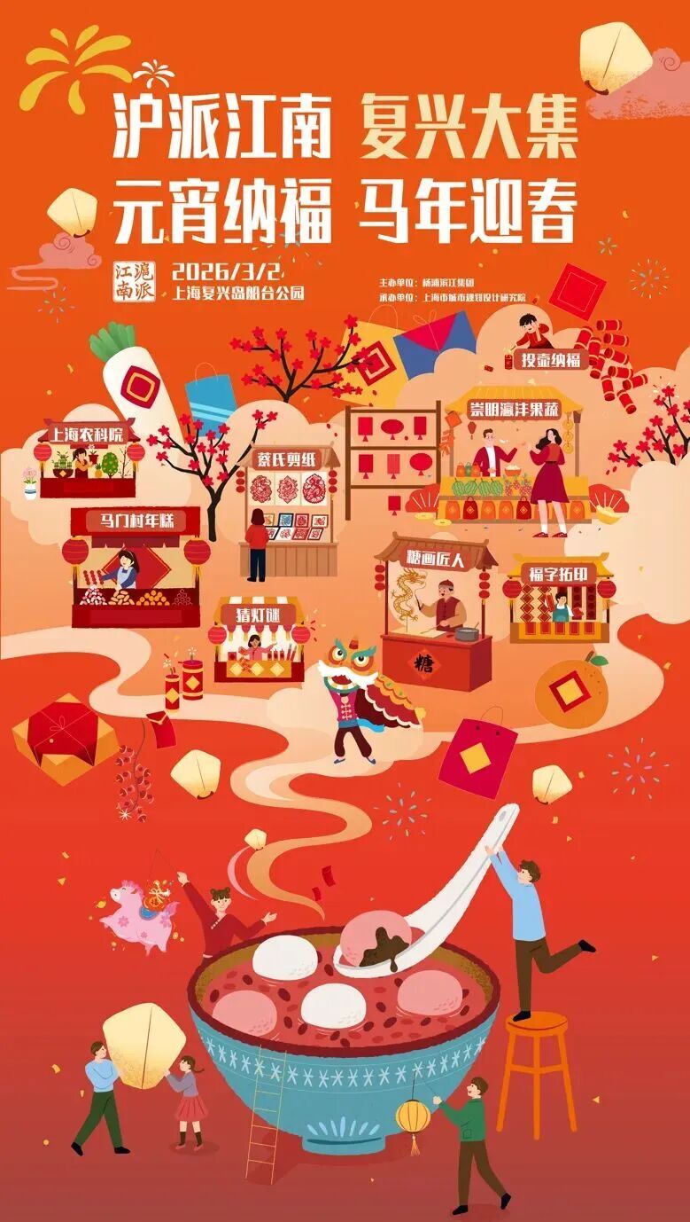 上元启新,沪韵流转,2026年马年元宵佳节,沪派江南·复兴大集邀您共赴团圆盛宴,沉浸式体验“赏花灯、品非遗、逛市集、接好运”,在浓醇烟火气中,共度最有腔调的沪派江南元宵佳节。3月2日,非遗舞狮开道,猜灯谜、玩投壶、做糖画、制香囊,在沪派烟火里把年味拉满,把马年好运稳稳接回家!