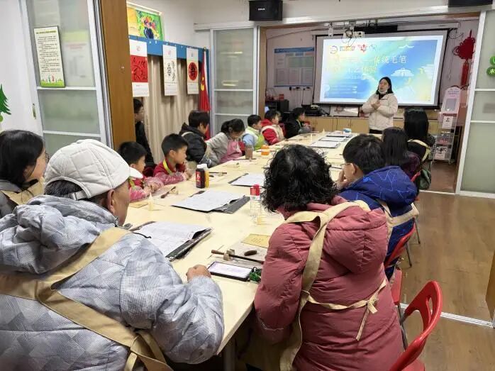 “笔下春秋”毛笔制作工艺体验中,孩子们在社区书画爱好者的陪伴下,完成打磨笔杆、黏合笔头、上蜡等步骤,并进行“开笔”,用自己制作的毛笔蘸墨挥毫,写出两代人心意的连接。