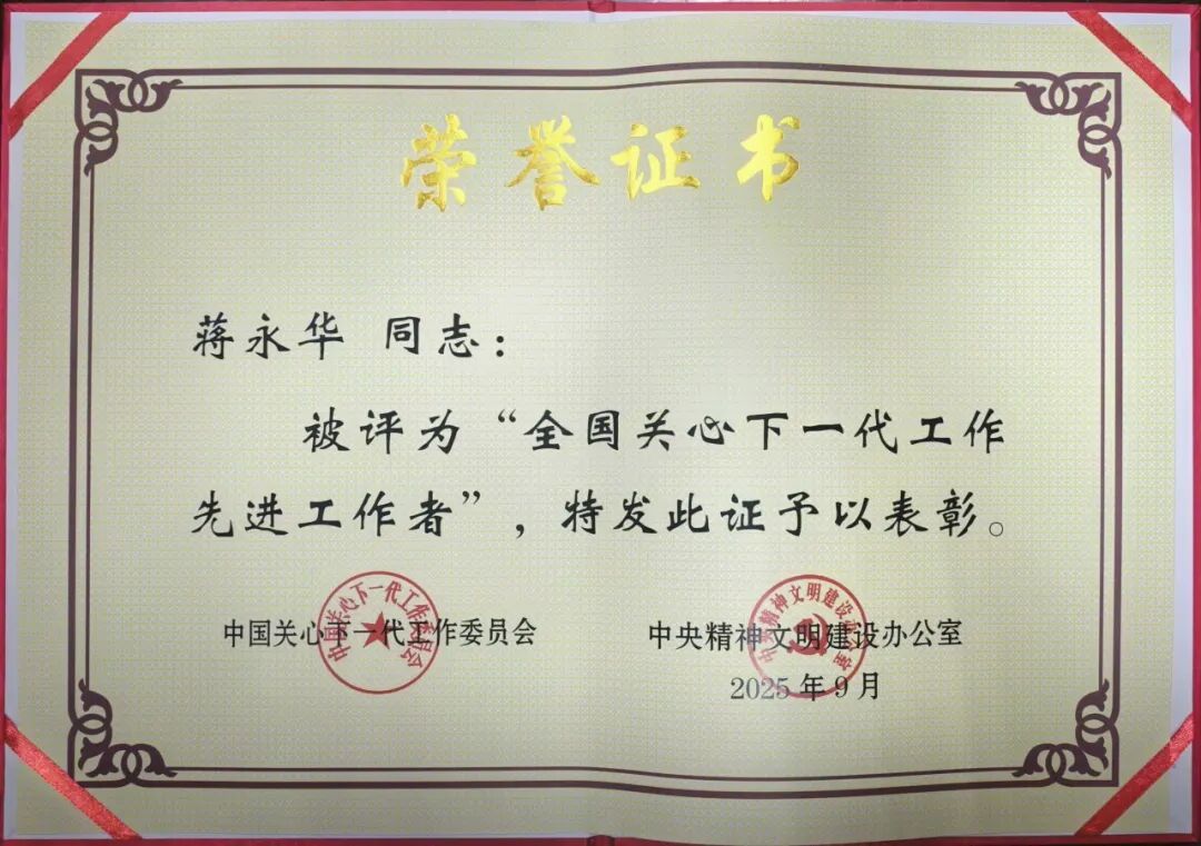 这一荣誉是对蒋永华同志长期以来在关心下一代事业中倾注心血、无私奉献的高度肯定。