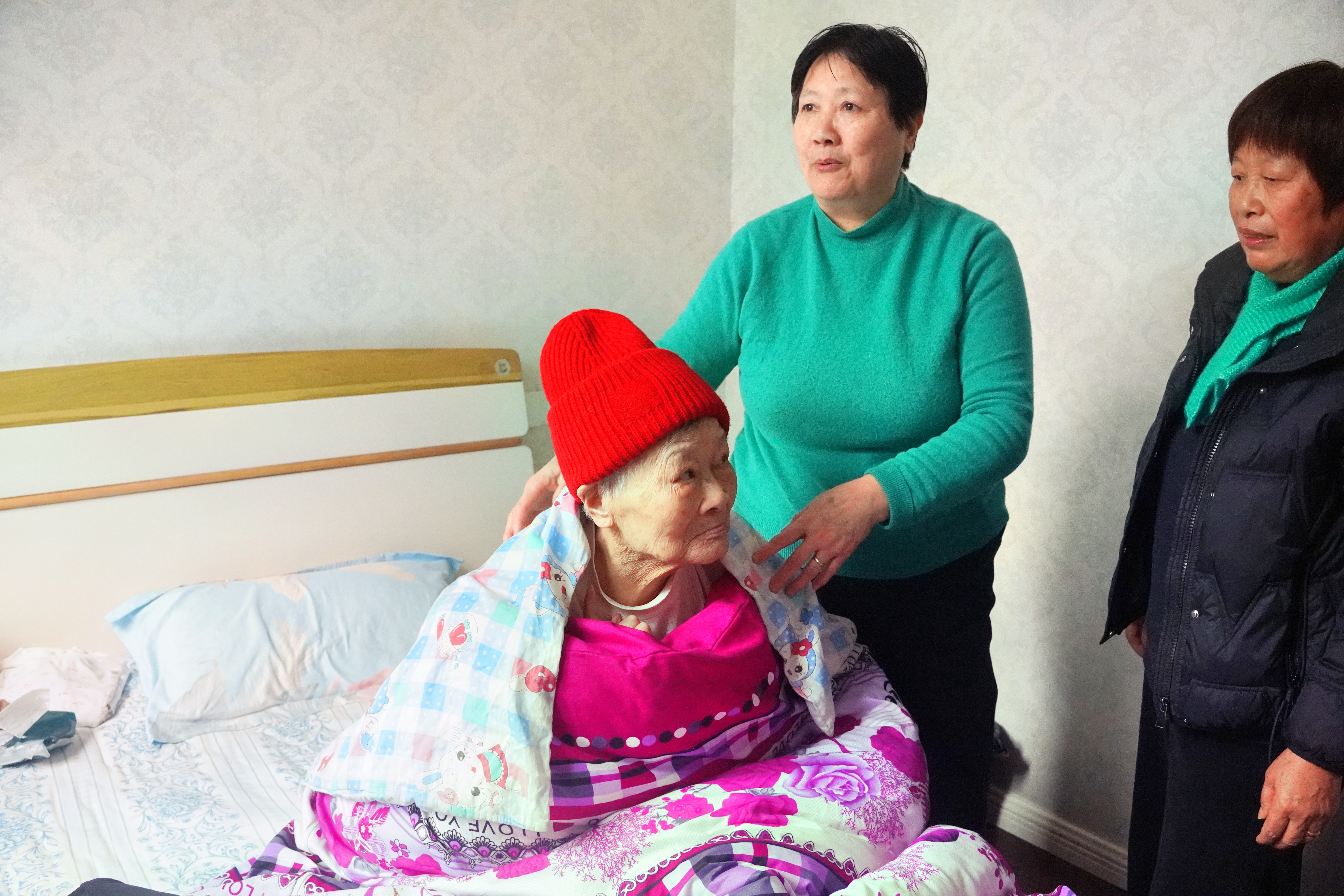 任慧琴老人(左)和女儿许卫君(中)、志愿者俞娟英在一起