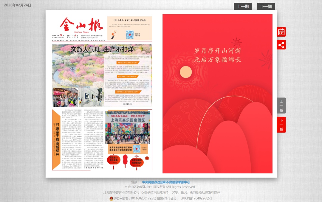 据介绍,随着媒体融合发展的深入推进,《金山报》在出版发行模式上也与时俱进。自2025年1月起,《金山报》已调整发行模式,全面拥抱数字化转型。目前,报纸内容同步以线上数字版形式呈现,市民读者可通过“上海金山”APP或《金山报》电子版网页(http://www.jsbao.com)随时随地查阅每期内容,享受更即时、更便捷的阅读体验。