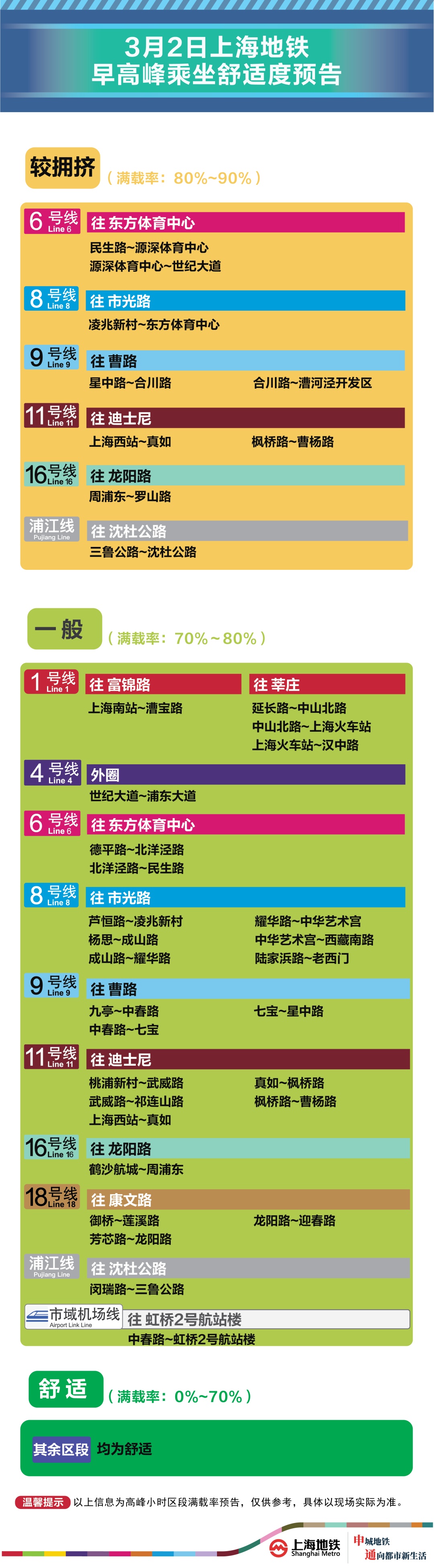 为提升上海地铁早高峰期间出行服务水平,提升乘客乘坐体验,上海地铁向乘客提供乘坐舒适度预告,方便乘客提