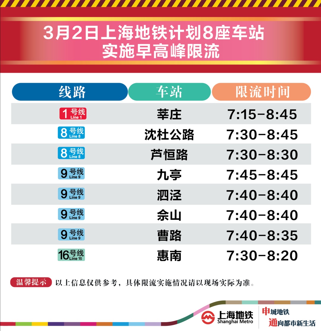 3月2日早高峰莘庄、沈杜公路等8座地铁站计划限流