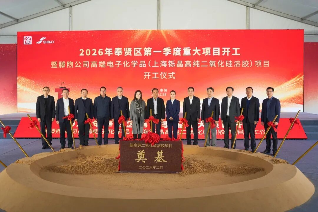今天(2月28日)上午,奉贤区举行2026年第一季度重大项目开工暨滕煦公司高端电子化学品(上海铄晶高纯二氧化硅溶胶)项目开工仪式。区委书记刘平出席并宣布开工,区委副书记、区长王益群致辞,并与区人大常委会主任张培荣、区政协主席陈勇章、区委副书记唐晓腾等共同为项目培土奠基。