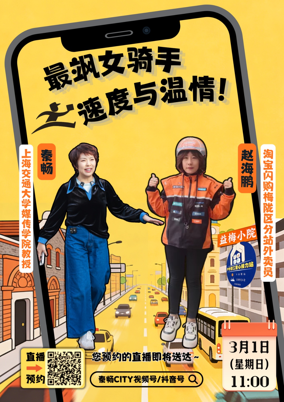 3月1日 11:00—13:00 “秦畅City”全程CityWalk直播 跟拍闵行女骑手赵海鹏真实跑单日常 看她如何接单、穿梭、送达 听她讲述在上海、看上海的故事 ↓↓↓