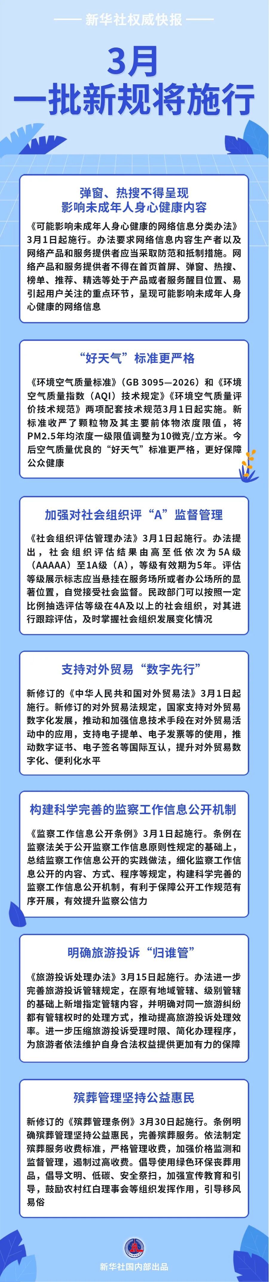 首页首屏、弹窗热搜等不得呈现影响未成年人身心健康的网络信息;“好天气”标准更严格,更好保障公众健康;加强对社会组织评“A”监督管理……3月,一批新规将施行,一起来看!