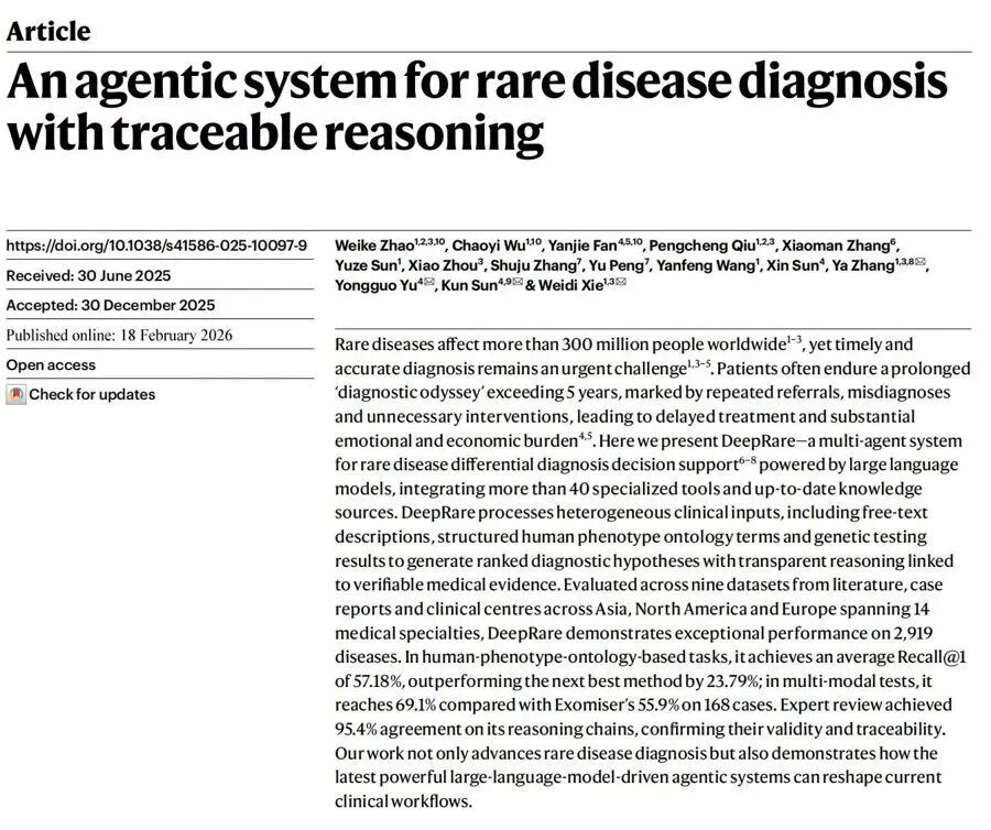 国际顶级学术期刊《自然》(Nature)在线刊发上海交通大学医学院附属新华医院团队与上海交通大学人工智能学院团队联合研究成果。这款全球首个可溯源智能体式罕见病诊断系统DeepRare,凭借首创的Agentic AI架构破解罕见病诊断世界性难题,诊断精度刷新世界纪录,其相关应用已服务全球600余家顶尖医疗科研机构,为全球罕见病患者点亮确诊希望,也标志着中国医工交叉创新成果站上世界舞台中央。(详情可点击跳转链接)