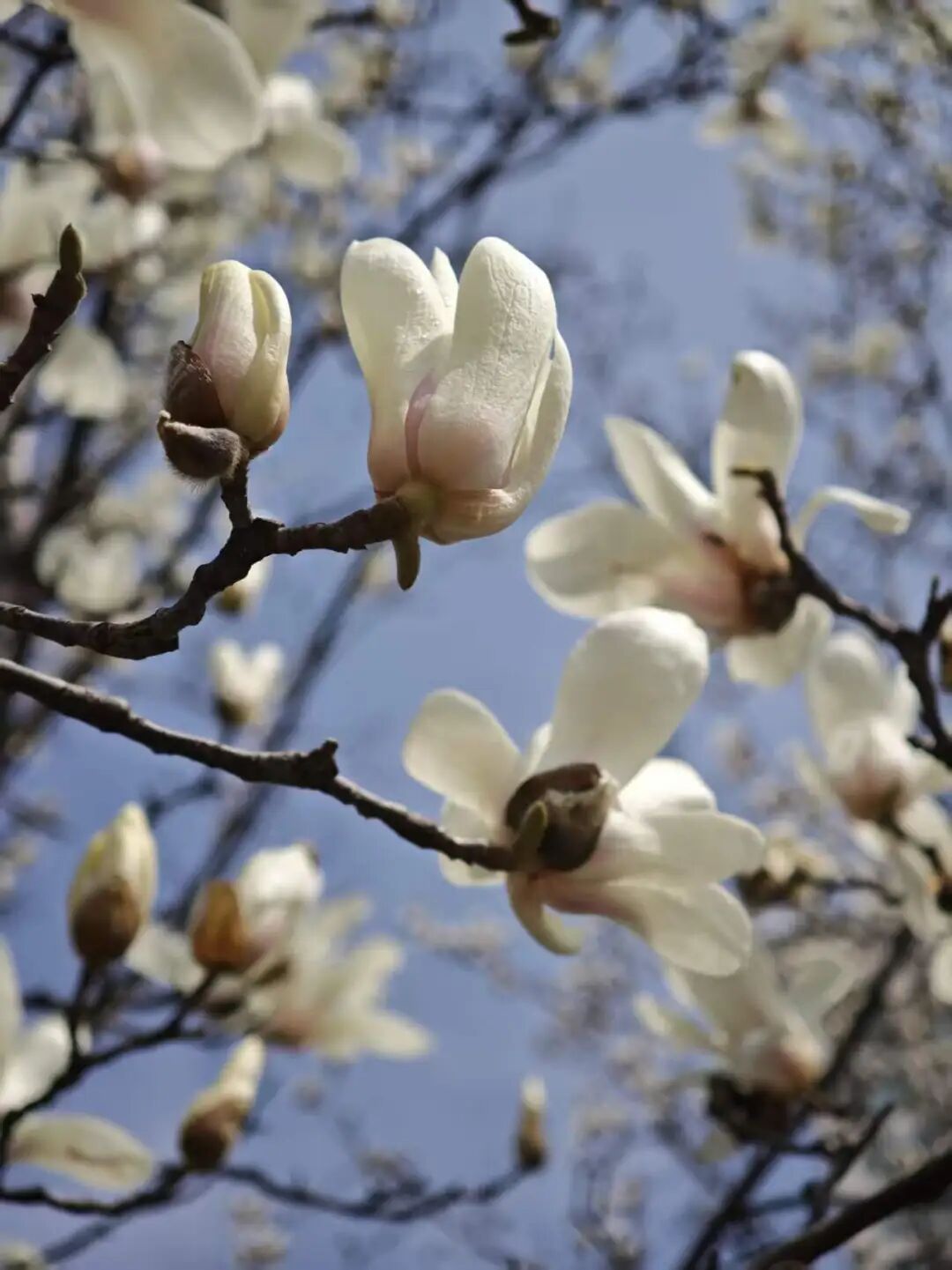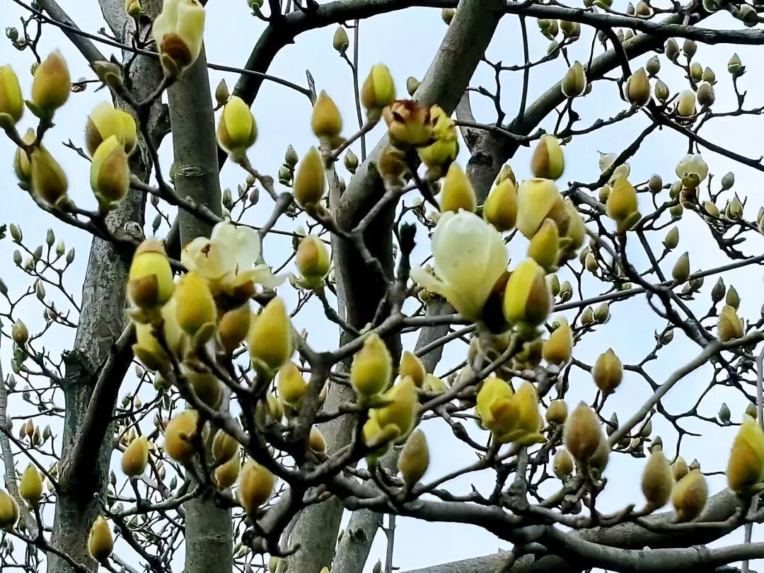 玉兰花花蕾萌发需要积攒足够的有效积温,当冬末初春气温逐步回升至适宜区间(15℃左右的多云天气最有利),玉兰便会打破休眠绽放。