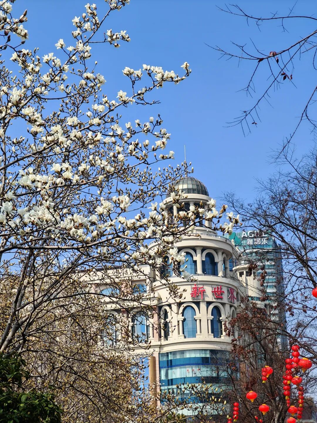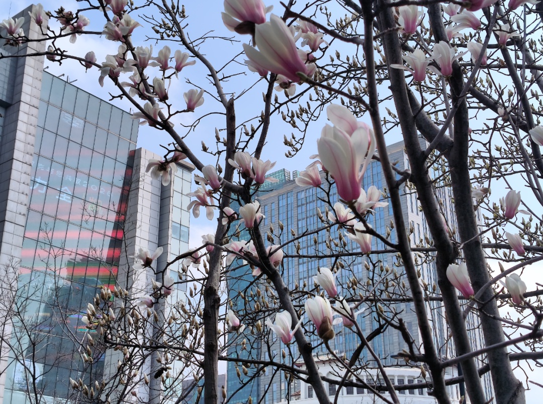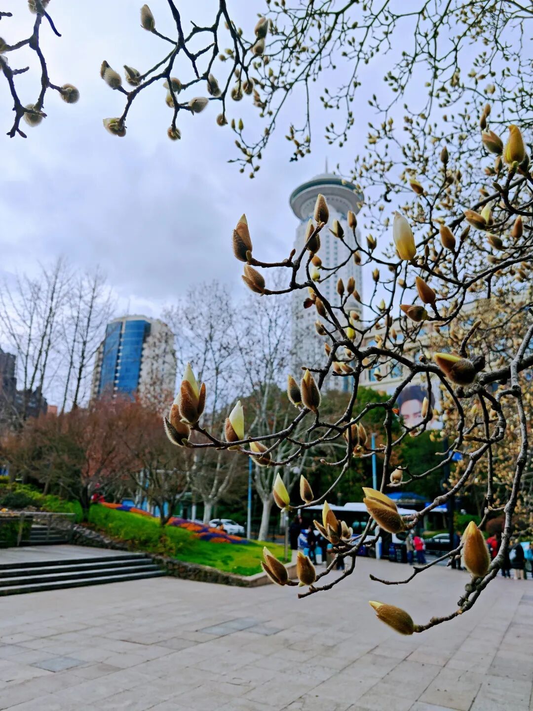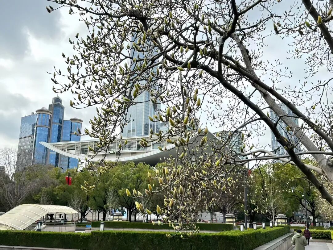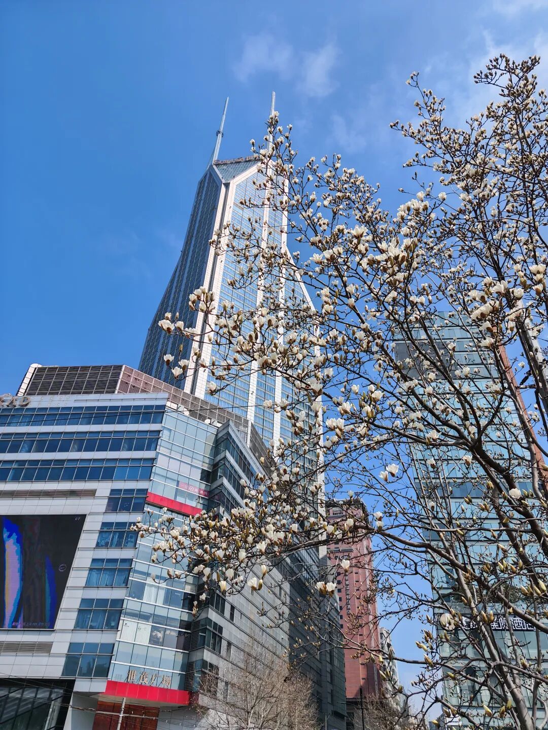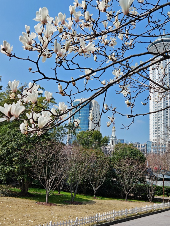 背靠城市建筑群,玉兰与城市天际线同框,自然与人文交融的独特景致,随手一拍即是电影感大片。