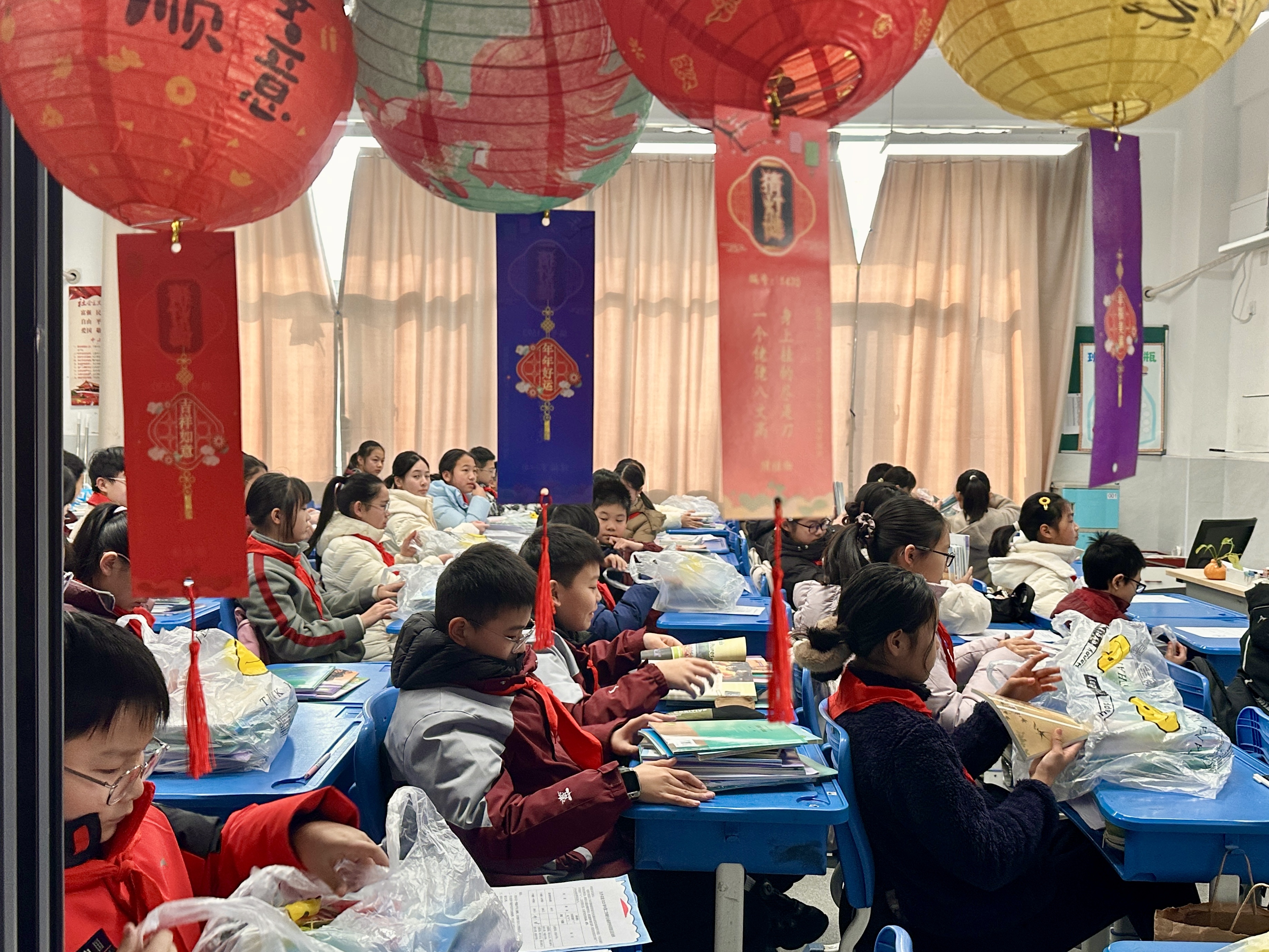 除了“萌马进校园”的惊喜,该校还在西门、南门主干道及教学楼周边精心打造了“成长花灯步道”。一盏盏灯谜花灯错落有致地悬挂着,五彩斑斓的谜条随风轻扬,营造出一个“沉浸式”的传统文化体验空间。高年级学生在领取新书后,纷纷三五成群地驻足于此,或低头猜谜,或热烈探讨谜底,成为校园的另一道风景线。