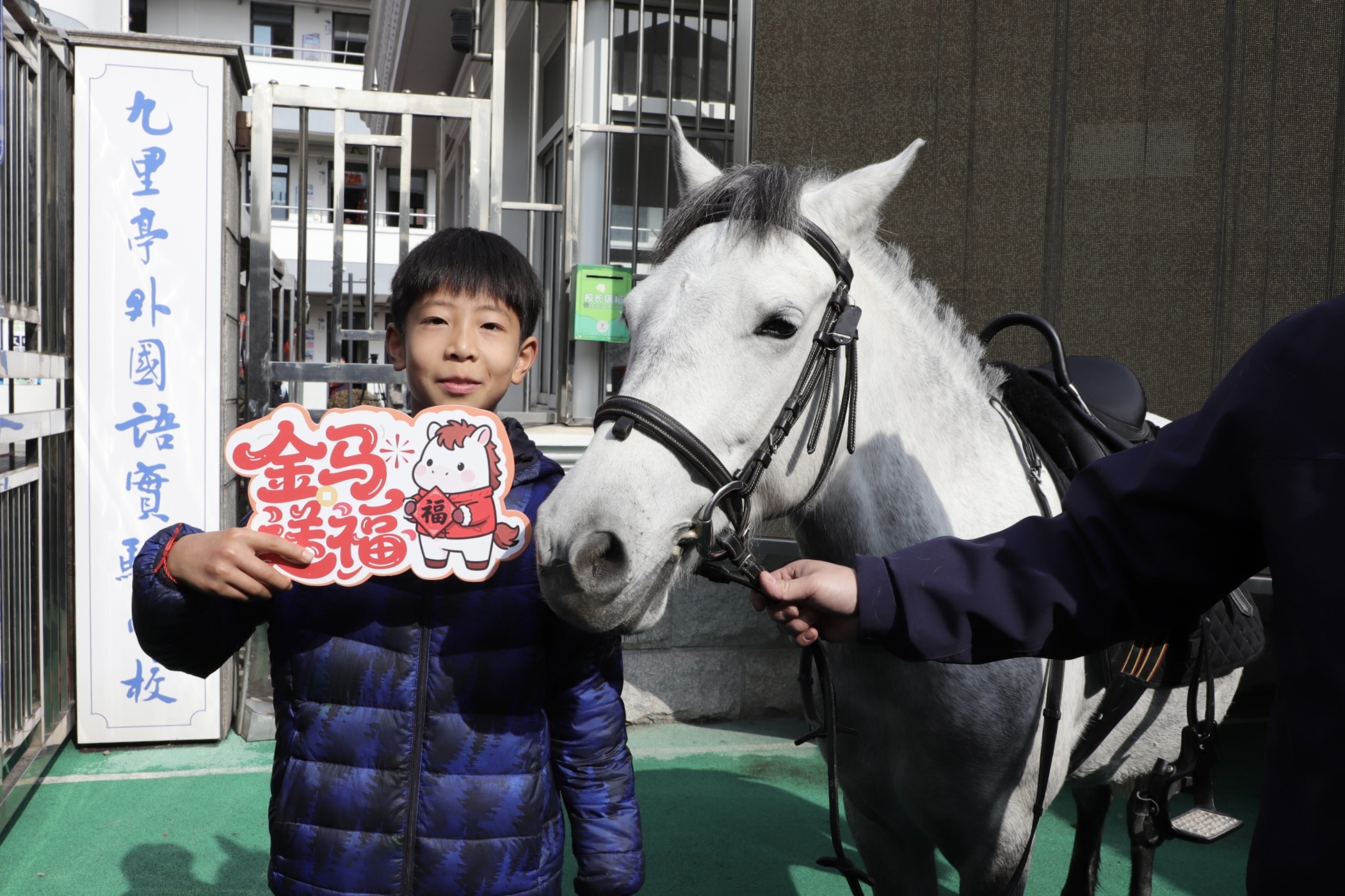 欢快假期进入尾声,新学期也如约而至。2月28日,两匹“幸福小马”亮相松江九里亭外国语实验学校,成为返校报到日最亮眼的 “明星”。