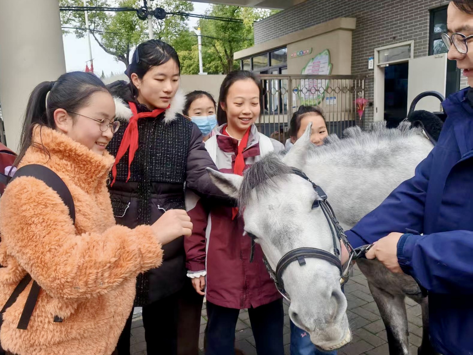 上午8时,校门口张灯结彩,白色小马“汤圆”和黑色小马“布朗尼”在专业马术教练牵引下提前就位,等候同学们的到来。孩子们一进校园,便被“萌马”吸引,纷纷围拢上前,争相与它们合影留念。胆子大的学生更是鼓足勇气,在欢笑声中伸出手抚摸小马的脸颊、耳朵。马术教练也借机向孩子们科普马匹习性、饲养常识等趣味知识。还有部分学生还在教练的指导下,穿戴好安全护具,学习起简单的骑马姿势与握缰方法。