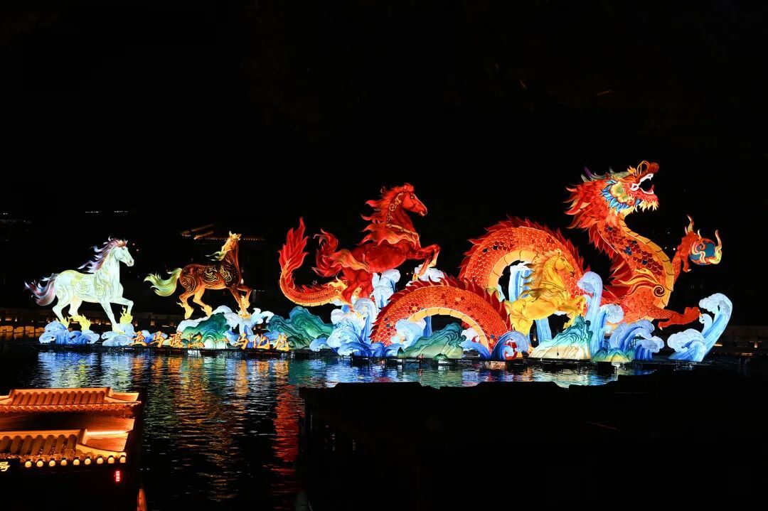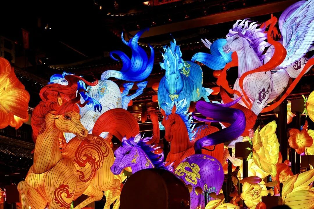 今年老门东的灯彩布局,以“马”为核心主题,营造浓郁新春氛围。生肖巨型飞马灯组在城墙下“飞驰”。