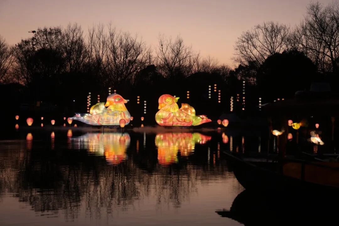 除了步行赏灯,今年还增加了西溪水上赏灯专线,是西溪夜游必冲项目。船桨轻摇,船身划破如镜的水面,光影随涟漪层层漾开,恰如闯入一幅流动的宋韵灯影图。沿途将邂逅鸳鸯戏水、西溪游灯录、瑞兽贺春、浮光渔梦、夜灯入画五大核心灯组,每一处都是独属于西溪的水乡浪漫。