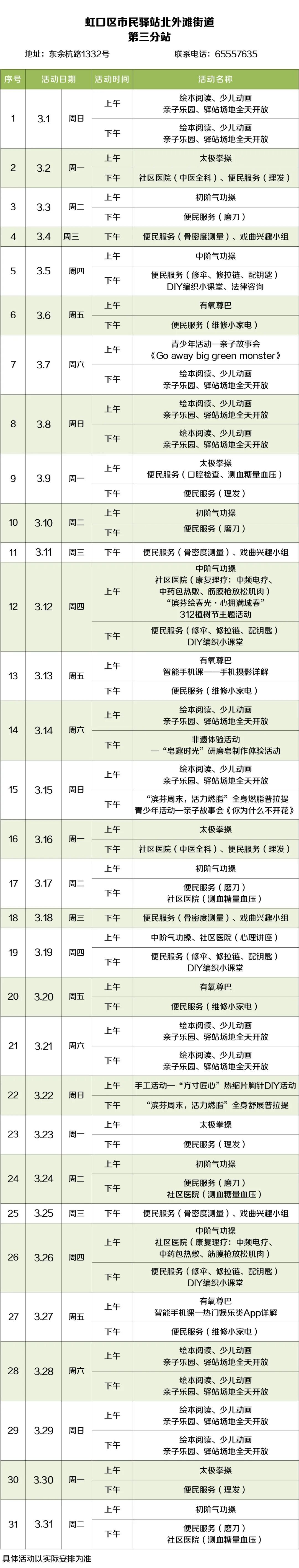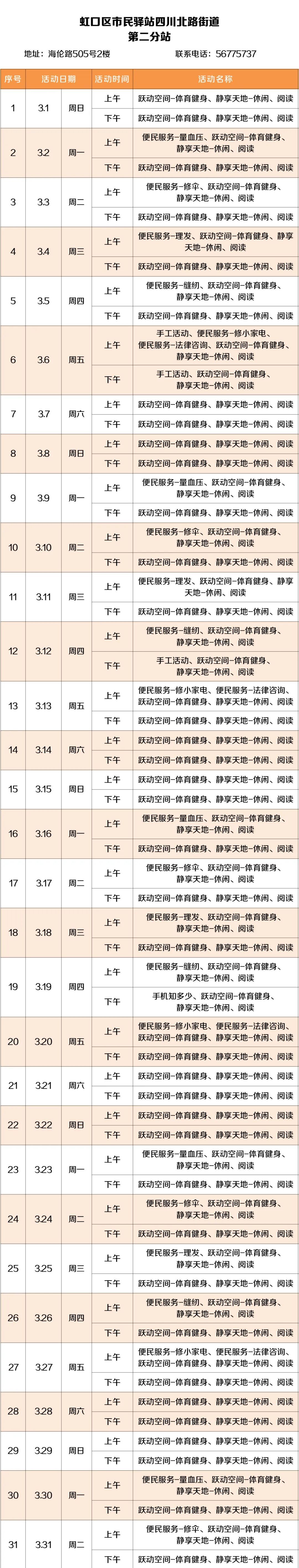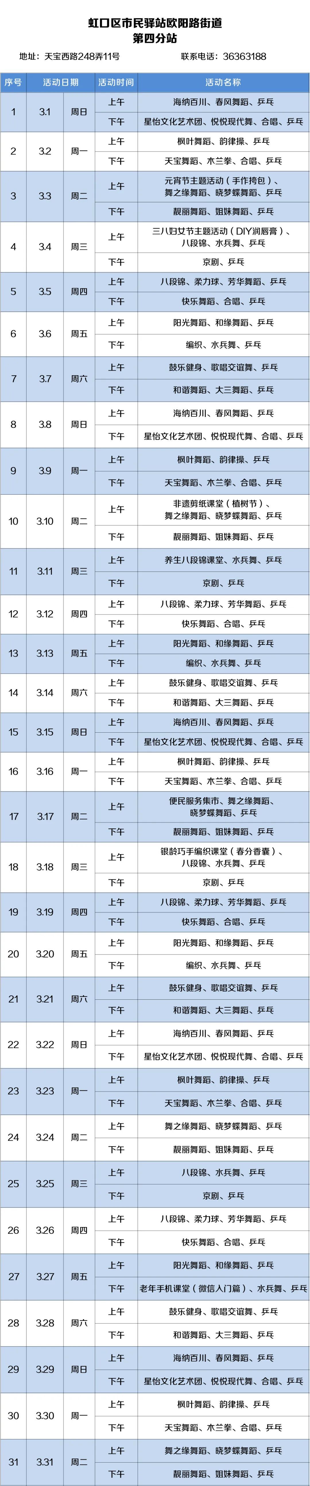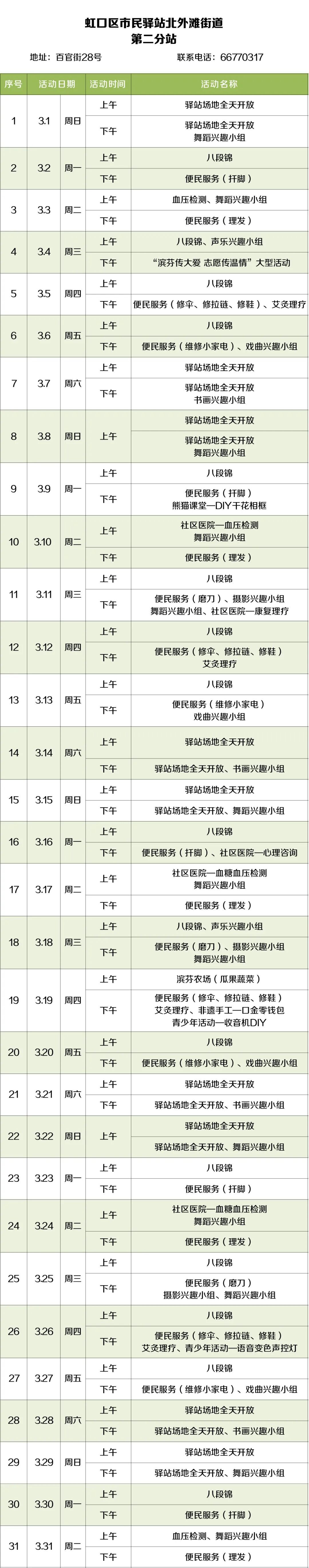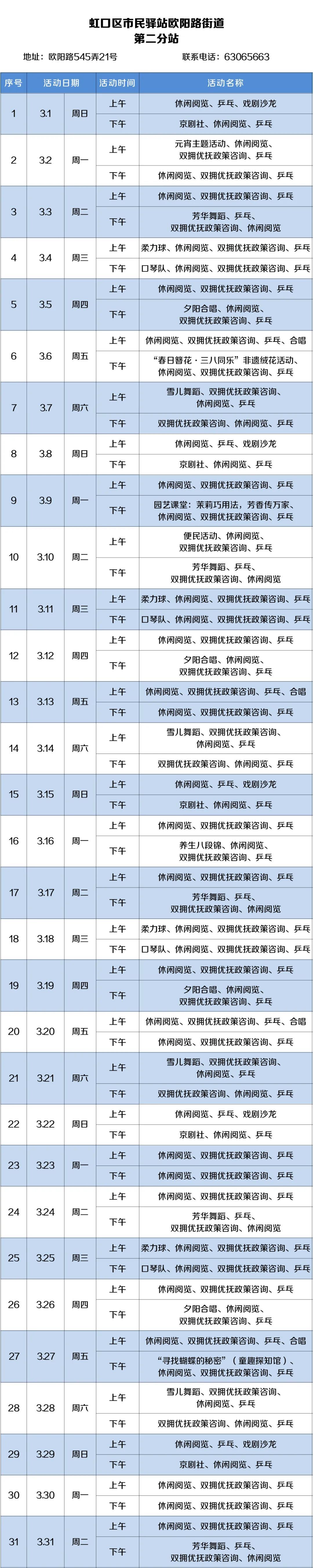 2026年3月,虹口的市民驿站活动内容已排定!为了让广大居民朋友能提前规划、充分参与,小虹为大家送上虹口各市民驿站三月的活动安排表,快来瞧瞧家门口的市民驿站都准备了哪些丰富多彩的活动~ 四川北路街道 (点击图片可放大查看) 欧阳路街道 (点击图片可放大查看) 嘉兴路街道 (点击图片可放大查看) 曲阳路街道 (点击图片可放大查看) 北外滩街道