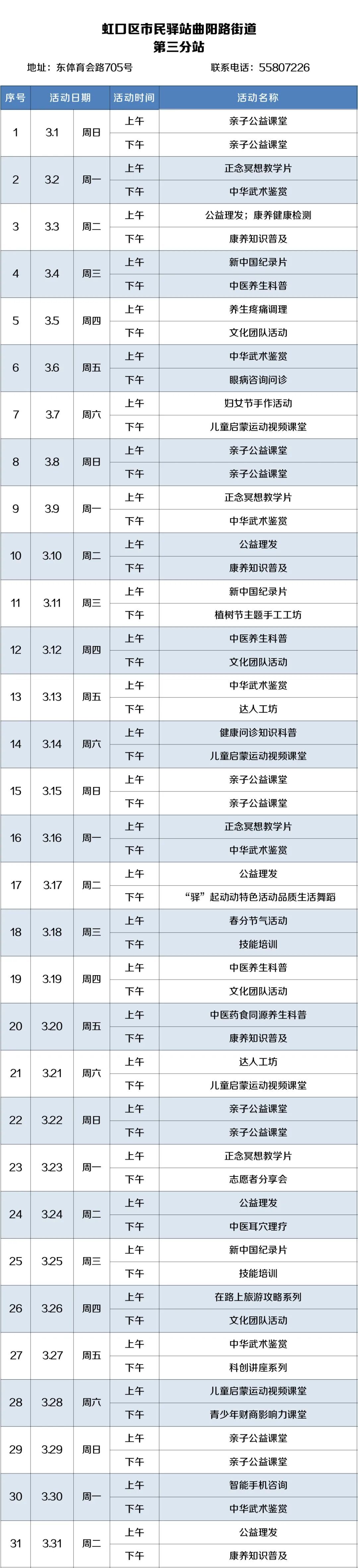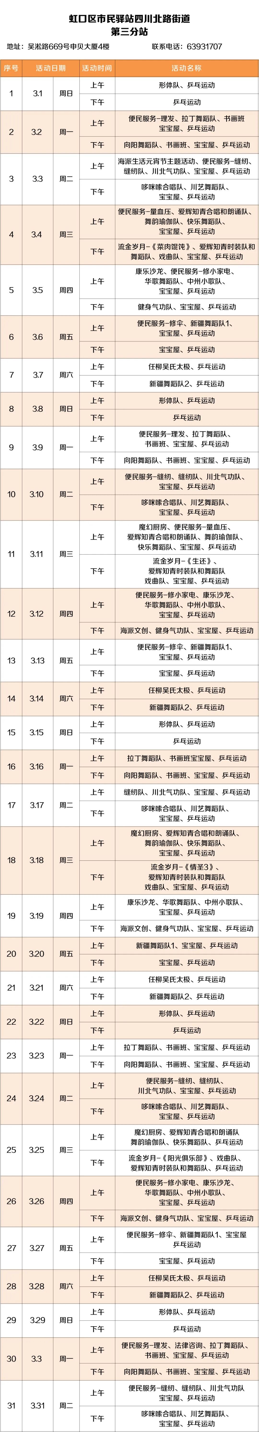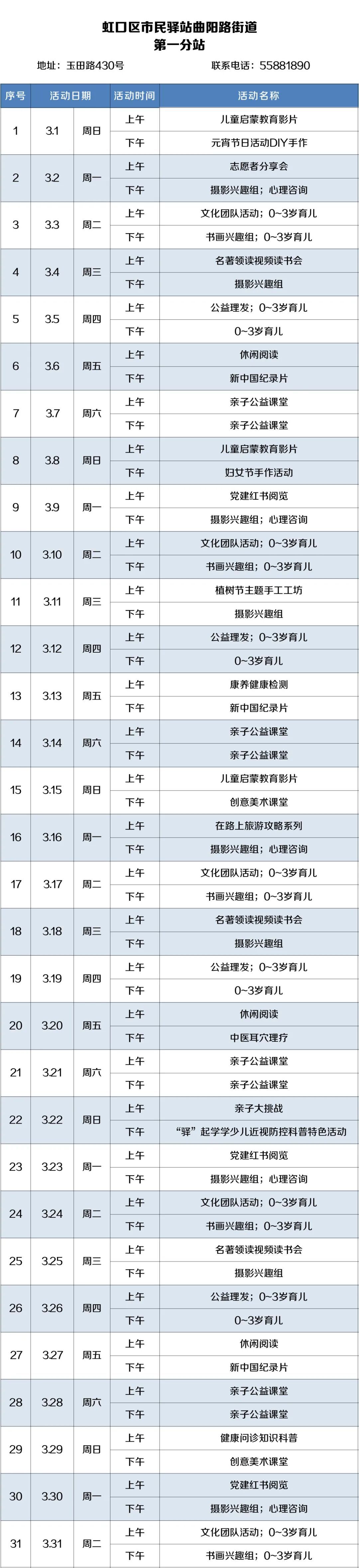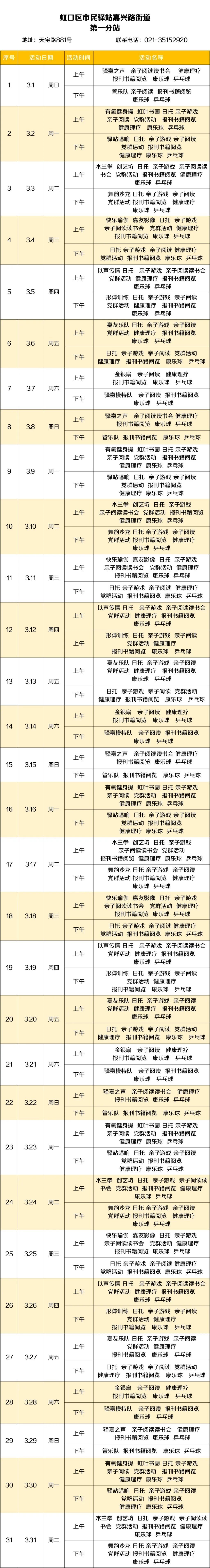 2026年3月,虹口的市民驿站活动内容已排定!为了让广大居民朋友能提前规划、充分参与,小虹为大家送上虹口各市民驿站三月的活动安排表,快来瞧瞧家门口的市民驿站都准备了哪些丰富多彩的活动~ 四川北路街道 (点击图片可放大查看) 欧阳路街道 (点击图片可放大查看) 嘉兴路街道 (点击图片可放大查看) 曲阳路街道 (点击图片可放大查看) 北外滩街道