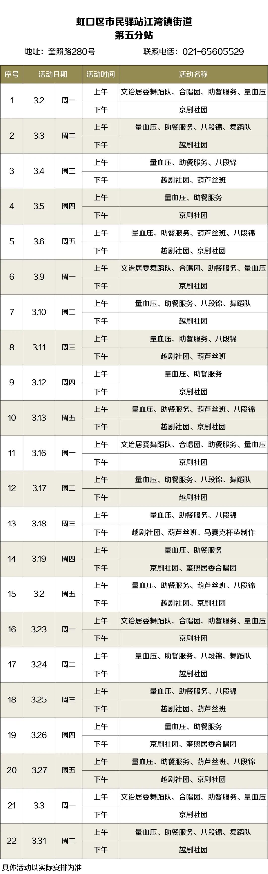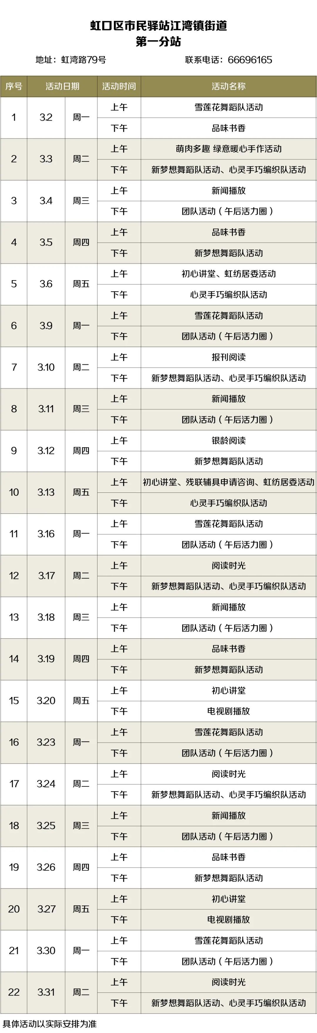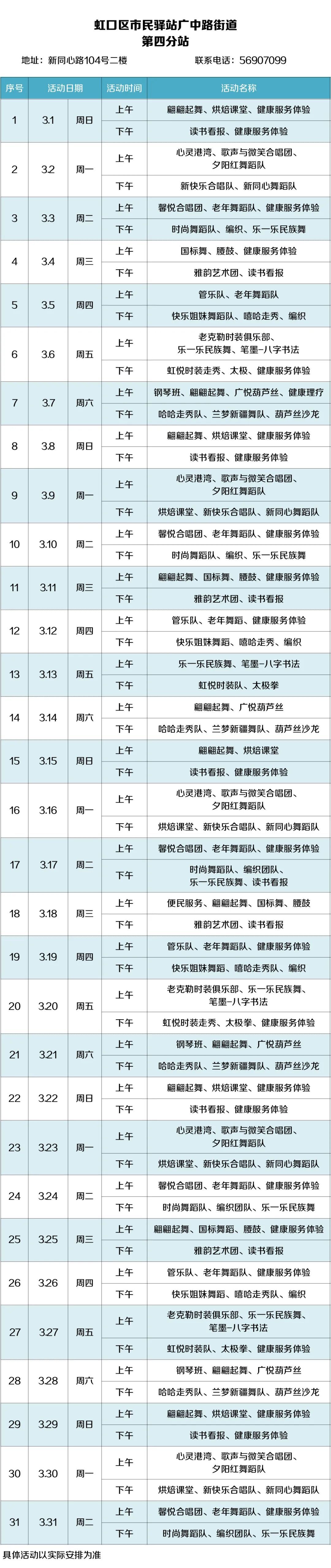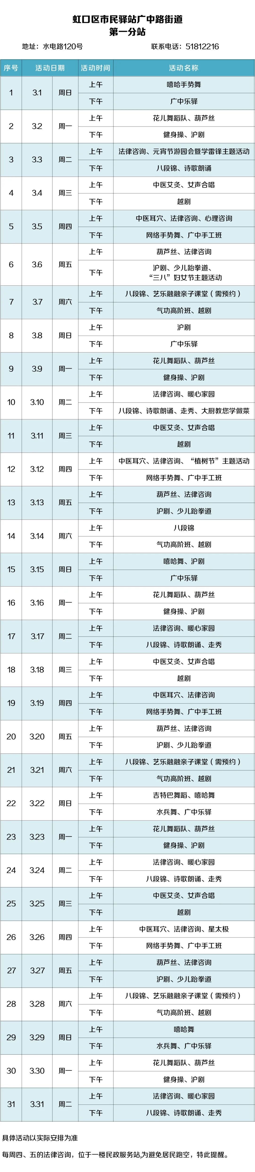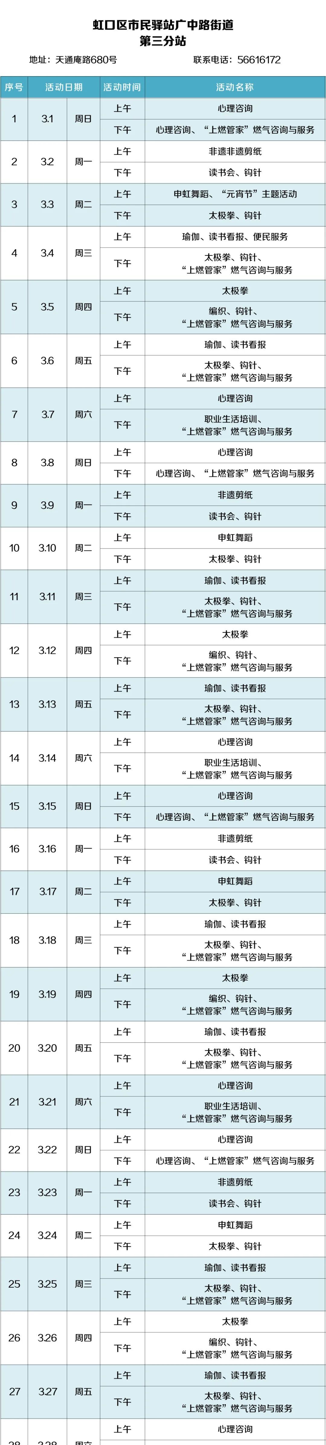 2026年3月,虹口的市民驿站活动内容已排定!为了让广大居民朋友能提前规划、充分参与,小虹为大家送上虹口各市民驿站三月的活动安排表,快来瞧瞧家门口的市民驿站都准备了哪些丰富多彩的活动~ 四川北路街道 (点击图片可放大查看) 欧阳路街道 (点击图片可放大查看) 嘉兴路街道 (点击图片可放大查看) 曲阳路街道 (点击图片可放大查看) 北外滩街道