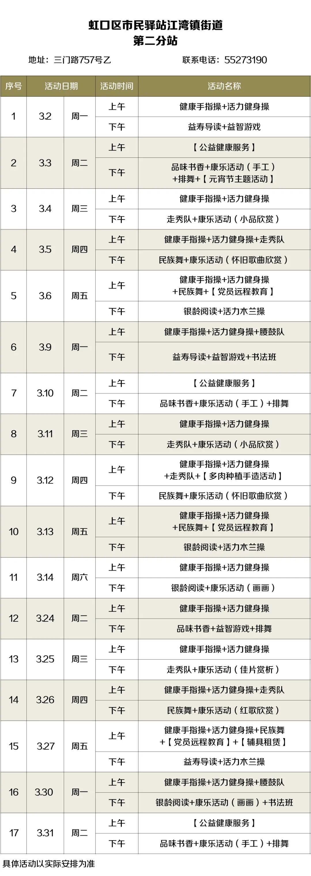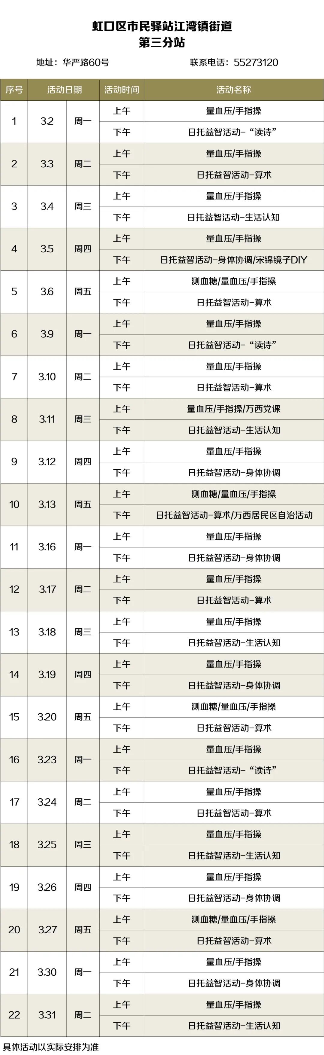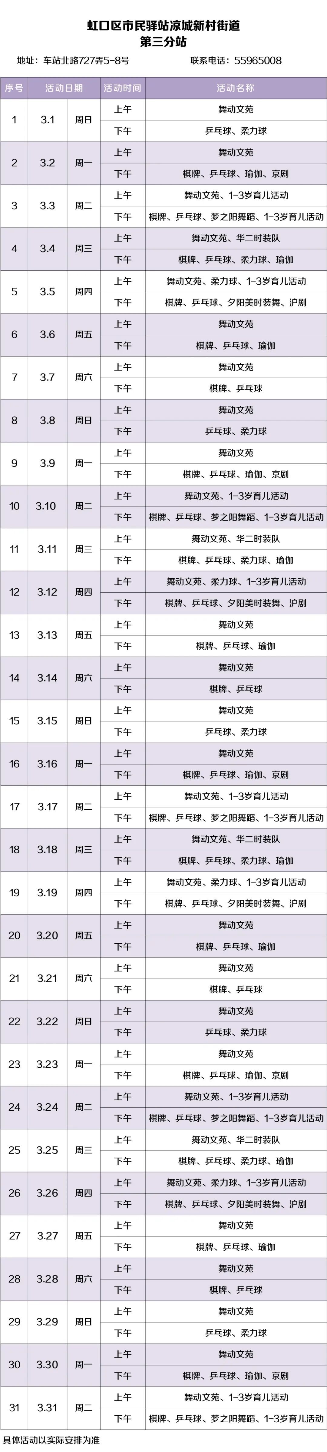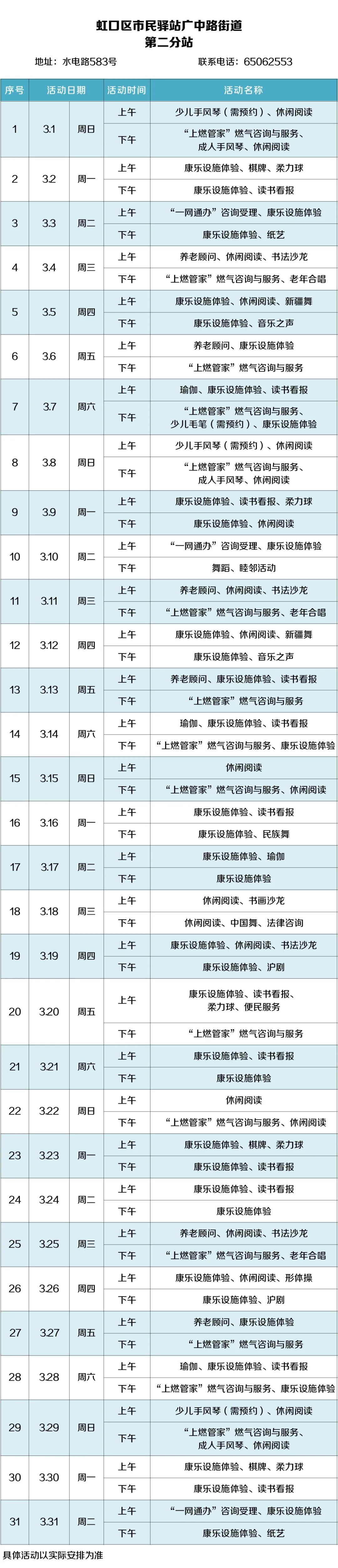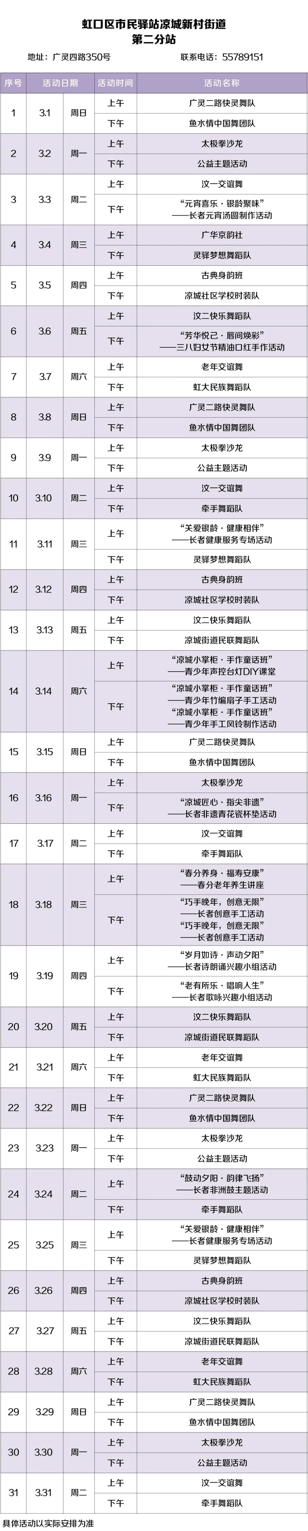 2026年3月,虹口的市民驿站活动内容已排定!为了让广大居民朋友能提前规划、充分参与,小虹为大家送上虹口各市民驿站三月的活动安排表,快来瞧瞧家门口的市民驿站都准备了哪些丰富多彩的活动~ 四川北路街道 (点击图片可放大查看) 欧阳路街道 (点击图片可放大查看) 嘉兴路街道 (点击图片可放大查看) 曲阳路街道 (点击图片可放大查看) 北外滩街道