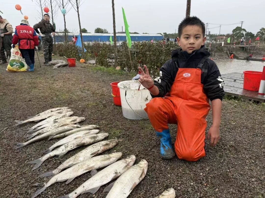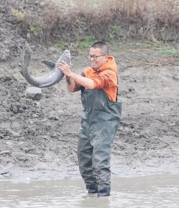 家长吴先生手捧一条15斤的乌青还不满足,打算等一下再下去试试。他风趣地表示:“在泥塘下面完全看不清楚,能抓到是运气好,鱼自己钻到网里的。塘里摸鱼很有意思,不过新年上班可不能‘摸鱼’。”
