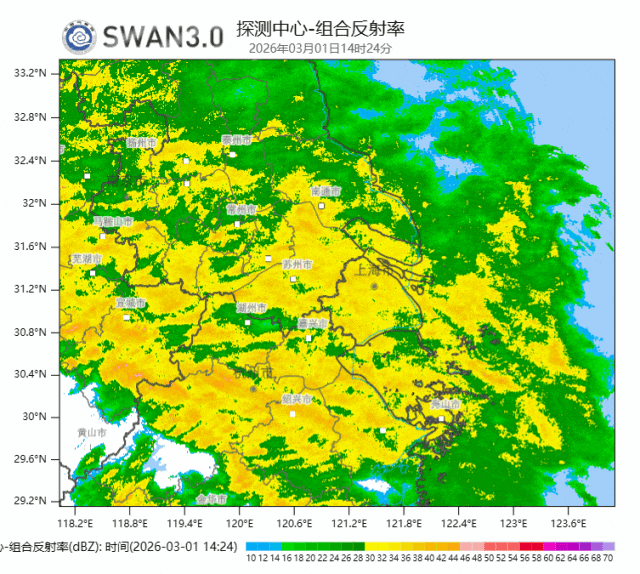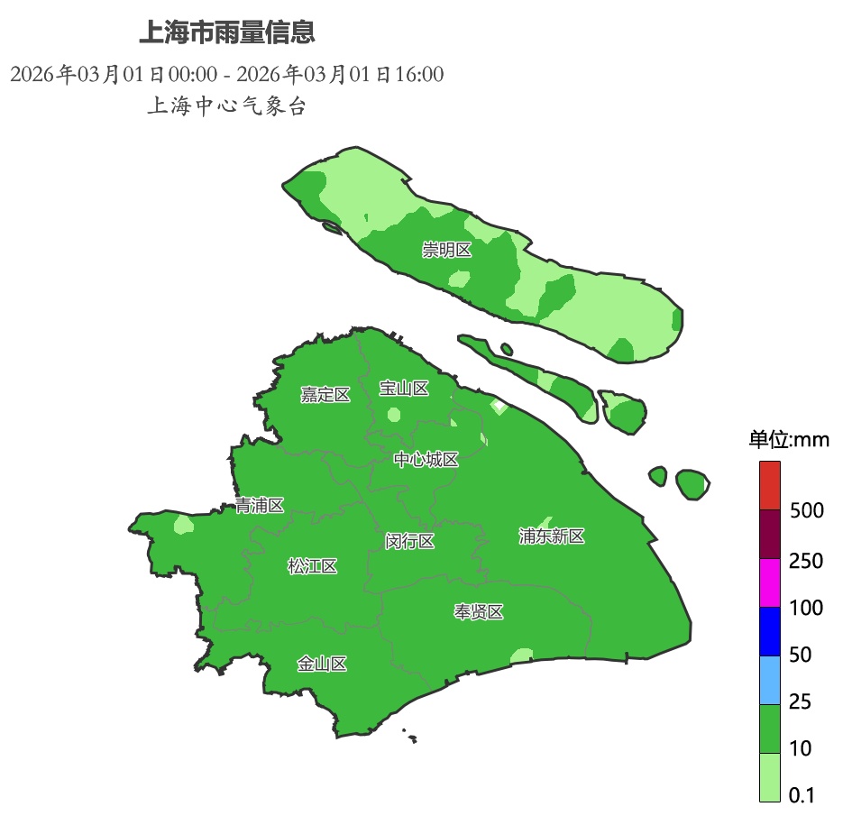今天申城陆续转雨,到了中午雨势加强。统计今天00时到16时降雨量显示,全市普降中雨。雨水打压下气温起伏不大,全市最高气温在12~14℃,市区徐家汇站13.3℃。