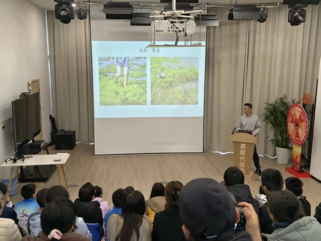 “面对浒苔危害,我们能做什么呢?”宣讲现场,随着宣讲员的提问,台下小朋友们纷纷举手、各抒己见,现场氛围十分热烈。宣讲活动特邀自然资源部东海局保障中心宣讲员、无人机课题组组长杨深担任主讲。作为常年奋战在东海区海洋监管一线的科技工作者,杨深以2008年青岛海域浒苔保卫战为切入点,将前沿无人机监测技术与海洋生态知识深度融合,用通俗易懂的语言,系统讲解了浒苔的生长特性、爆发成因及生态危害。