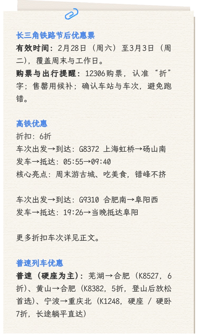中国铁路上海局集团有限公司(以下简称上铁集团)介绍长三角铁路节后优惠票方案新鲜出炉,坐火车可以享折扣啦!覆盖上海、杭州、合肥等热门城市↓ 小编现将车次整理如下 错峰出行的宝子们 高铁优惠速览: ◆ 6折专区: 合肥南→阜阳西(G9310)19:26出发当晚抵达阜阳,无论是周末返乡还是短途办事,这趟增开高铁都能帮你省下时间和路费,性价比直接拉满。 上海虹桥→砀山南(G8372),清晨5:55出发,9:40抵达。一早出发,上午就能抵达目的地,逛古城、吃美食,错峰出行不拥挤,打工人周末游的完美选择! ◆ 7折专区: 南京南→天门(D4115)6:35发车,10:33到达。早上出发,上午就能开启荆楚大地的探索之旅,无论是出差还是探亲,都是高效之选。 杭州东→贵阳北(G4025),6:30出发,15:09抵达。白天一路向西,饱览从江南水乡到云贵高原的风光变幻,下午就能漫步贵阳街头,品尝酸汤鱼的美味。 上海→萧县北(G9448),7:05出发,10:06抵达。开启游玩这座宝藏小城,这里风都带着羊肉的香气。 ◆ 热门线推荐: 上海虹桥→武汉(D4018)7折,5:01出发,趁着樱花季来临前,去武汉过早、逛黄鹤楼,错峰出行人少景美。 上海虹桥→贵阳北(G4021)沪杭6折、杭昆7折。一路向西直达贵阳。春天的贵州草长莺飞,千户苗寨、黄果树瀑布都在等你。