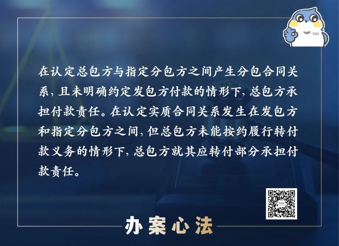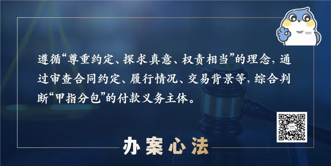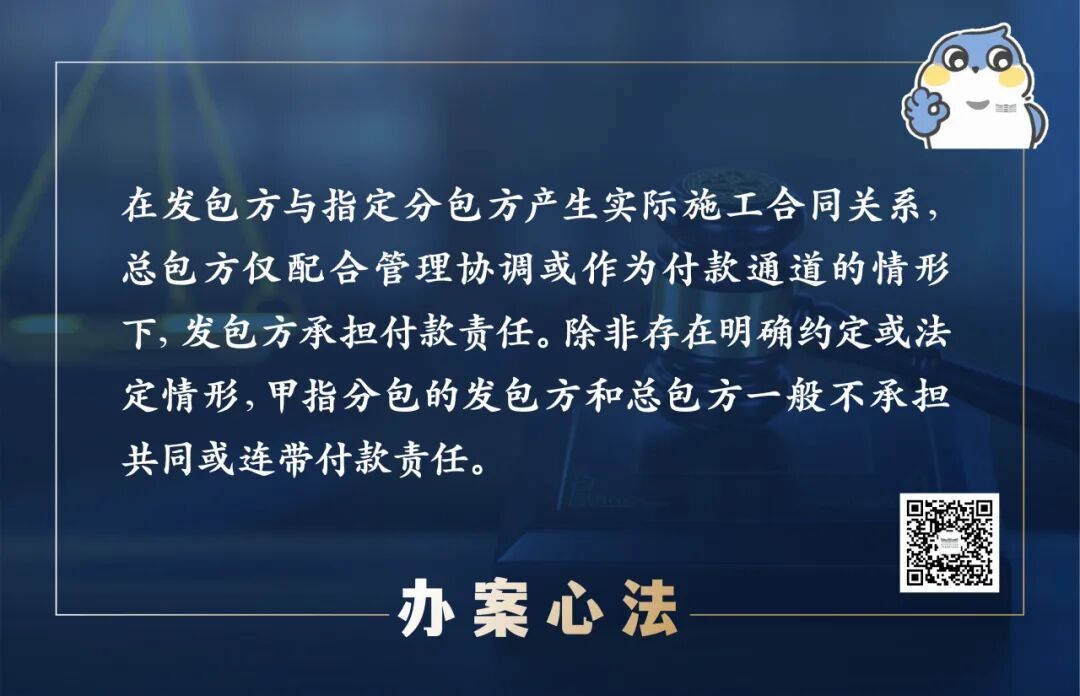 付款义务主体与工程管理主体不一定为同一主体。“甲指分包”下,总包单位仍需要对工程进度、质量、安全、现场协调等承担总包管理责任。所以,不能仅根据总包方参与施工管理或收取管理费来直接判定由总包方付款。