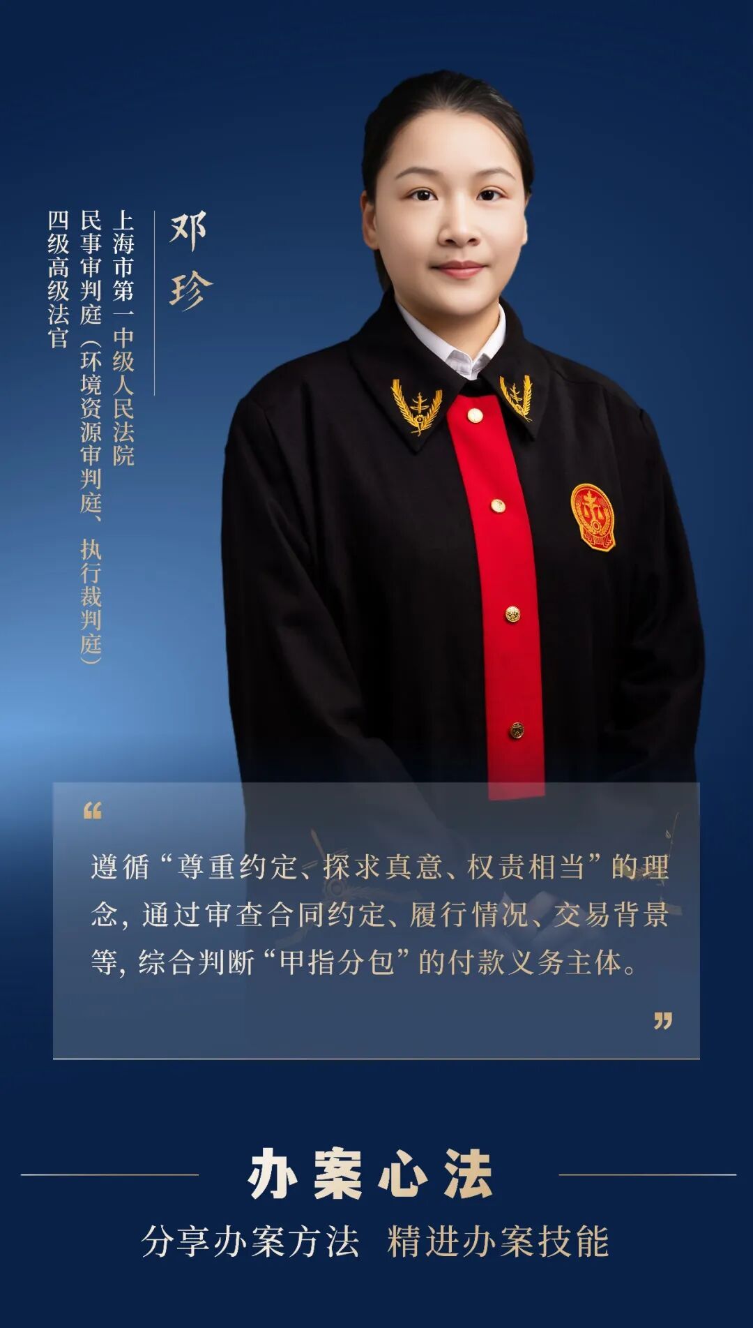本期“办案心法”栏目“上海法院审判业务骨干”特别专题,邀请上海法院审判业务骨干,上海市第一中级人民法院民事审判庭(环境资源审判庭、执行裁判庭)四级高级法官——邓珍为我们介绍建设工程“甲指分包”中付款义务主体的甄别与审查要点。