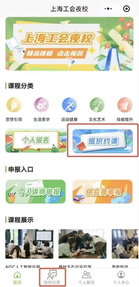 1.进入“工会夜校”小程序,点击“组织约课”版块,同时底部导航栏也有单独入口;