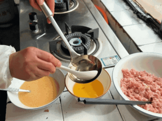 制作蛋饺,是四团人家家户户都熟悉的手艺。新鲜鸡蛋充分打散,色泽金黄透亮;精选肥瘦均匀的猪肉馅,简单调味,顺一个方向搅打上劲,鲜而不腻,香而不柴。