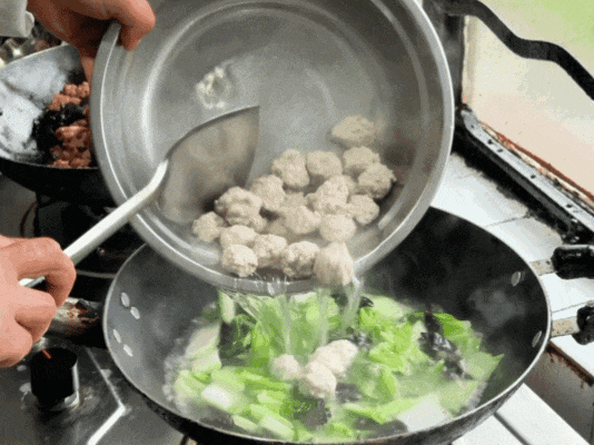 做好的蛋饺,搭配手工肉圆,慢火煮成一锅鲜醇蛋饺肉圆汤。蛋饺吸满汤汁,软嫩多汁;肉圆紧实弹牙,鲜香味浓;汤色清亮,暖意融融。一碗下肚,驱散寒意,暖胃更暖心,满是家的味道。
