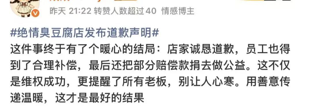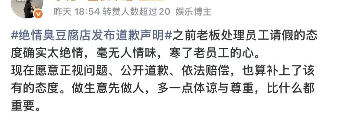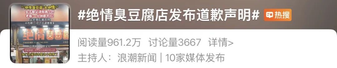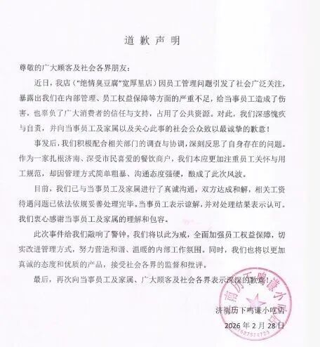 2月28日,涉事商家“绝情臭豆腐”店公开发布道歉声明称,事件暴露出“管理方式简单粗暴、沟通态度强硬”的问题,目前已与当事员工及家属“进行了真诚沟通,双方达成和解,相关工资待遇问题已依法依规妥善处理完毕”,并称当事员工表示谅解。声明承诺将“全面加强员工权益保障,切实改进管理方式”。