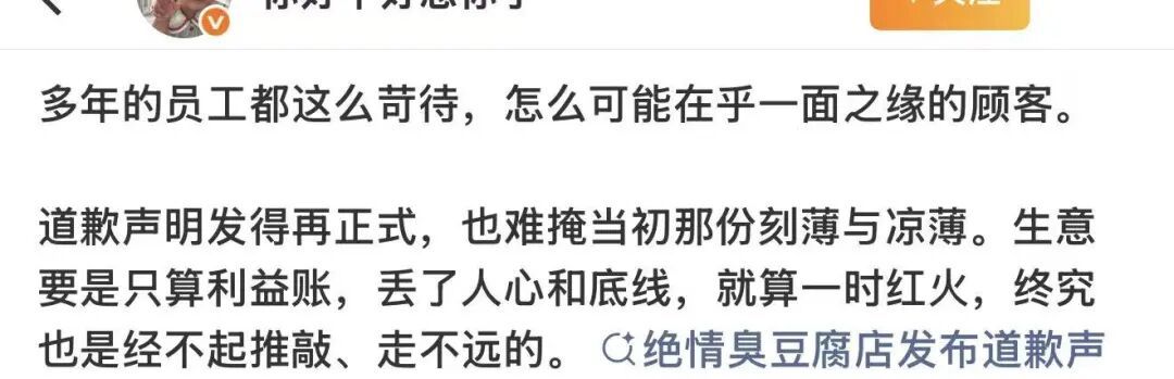 还有网友质疑店家对共事多年的老员工都如此刻薄,很难相信对待顾客的真心。同时提醒经营者,做生意要先做人,多一点体谅与尊重。