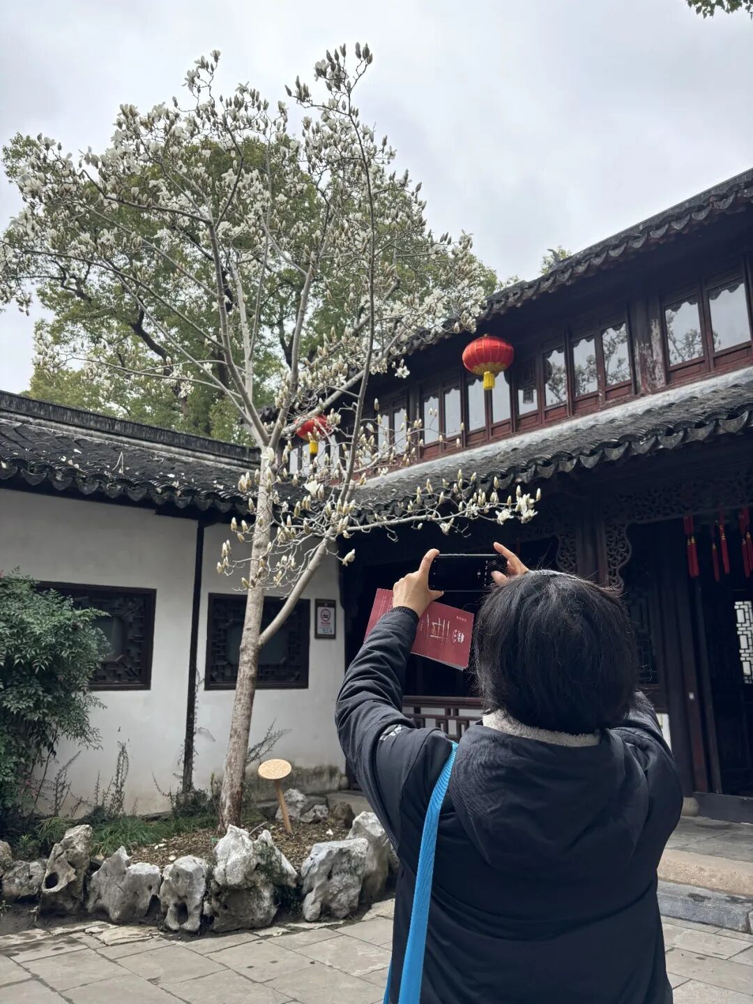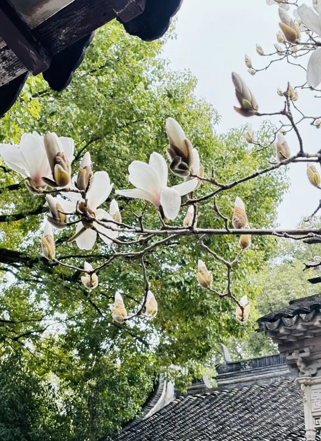 走进醉白池公园,粉墙黛瓦映衬、楼堂亭榭环绕间,数十株玉兰树亭亭玉立。枝头的白玉兰或含苞待放、饱满圆润,或悄然绽放、花瓣舒展,雪白的花朵宛如翩跹仙子。微风吹过,暗香浮动、花枝摇曳,勾勒出一幅清新雅致的春日画卷,美不胜收。