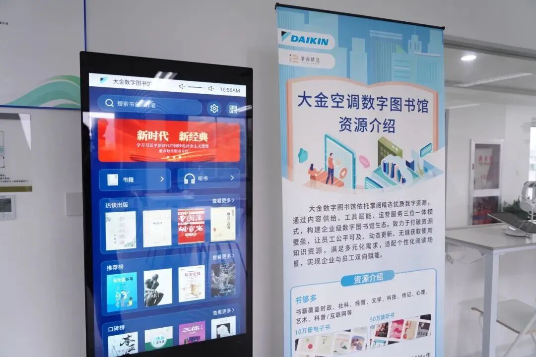 据介绍,大金空调为深入践行“新时代职工全生命周期服务”理念,积极响应上海市总工会“工会服务阵地焕新”三年行动,打造了职工数字化阅读空间——大金职工图书馆。该空间依托数字技术拓展服务边界,为企业文化建设注入新的“数智”动能。