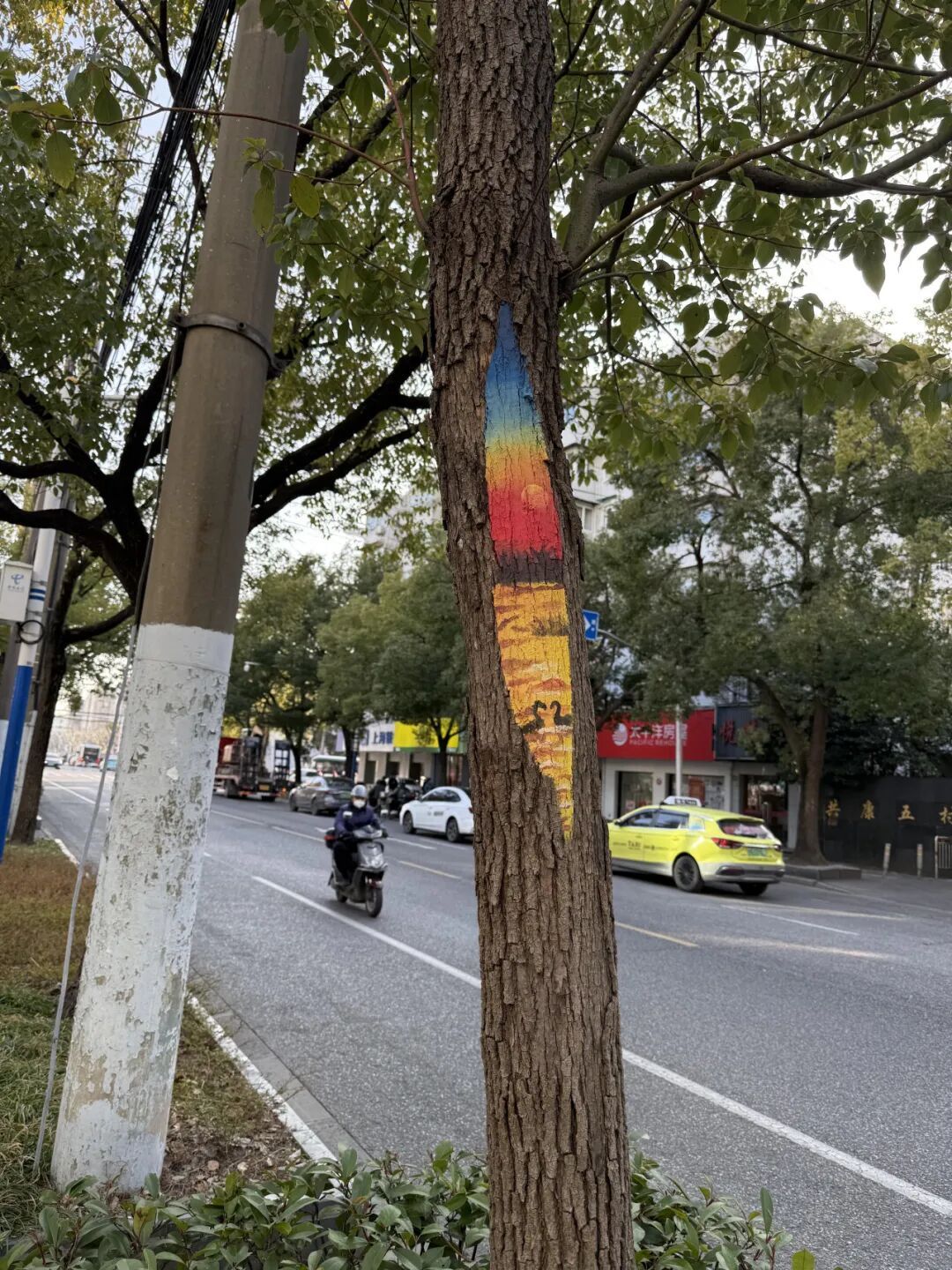 老树变身“艺术品”:修剪后的树木不挡光、无隐患,创意绘画让老树干成为街头小景;