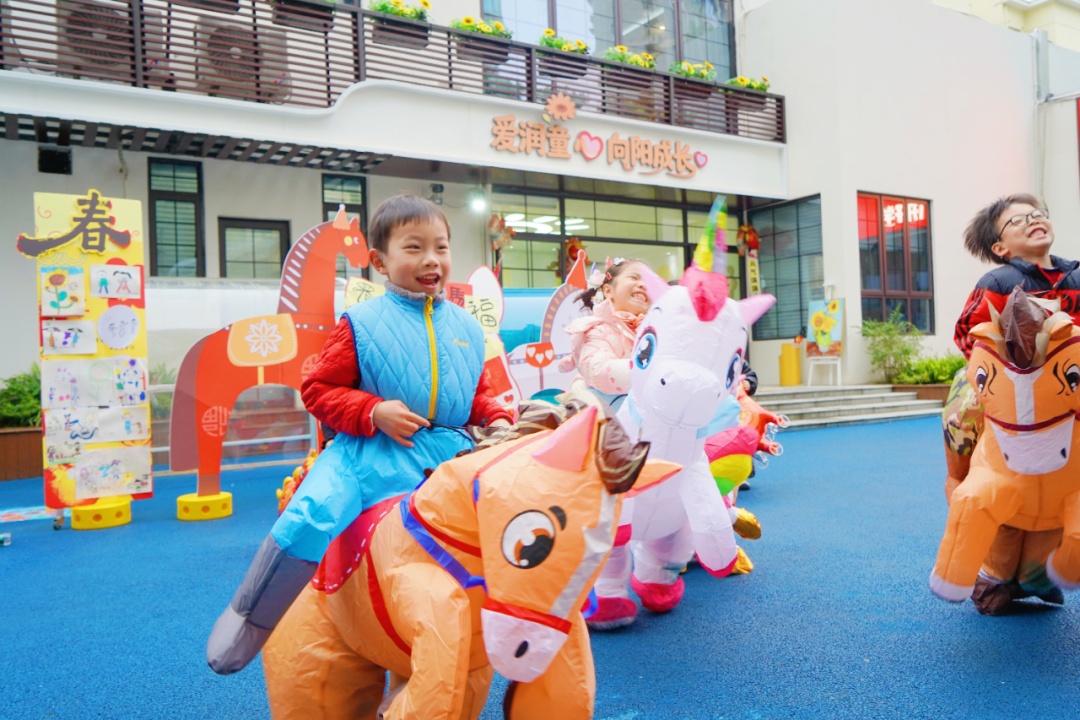 古美阳光幼儿园里,孩子们身穿福马玩偶服,手拉福马车,喜气洋洋入园,体验面塑小马、剪纸、唐三彩、创意拼贴等指尖非遗。无人机飞马互动穿梭其间,传统非遗与现代科技的相遇,让每个孩子在快乐与文化浸润中开启新学期。