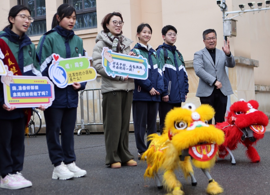 一大早,北京外国语大学附属上海闵行田园高级中学门口,两只身披红黄舞狮服的机器狗成为迎接同学们返校的“特殊使者”。学生们熟练操控着两只机器狗,只见它们灵活地摇头摆尾、踏步转身,时而做出跳跃、作揖的动作,逗得师生哈哈大笑。