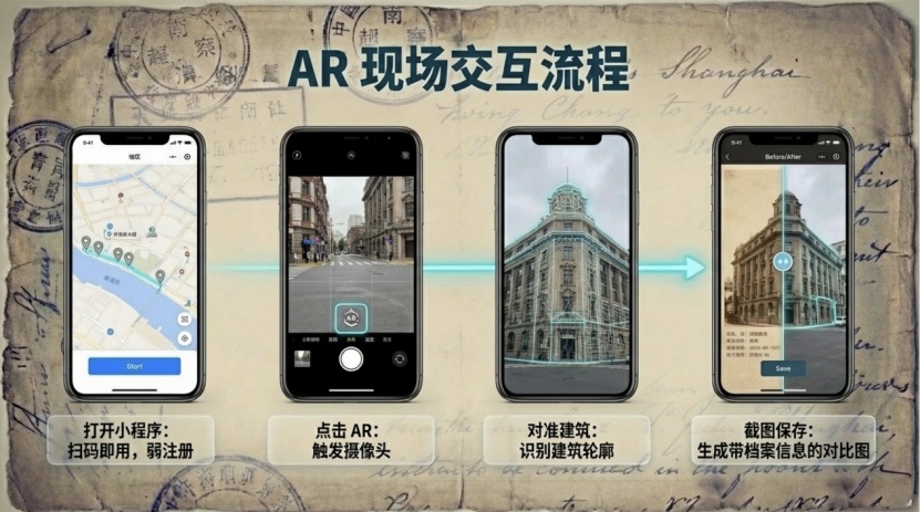 指导学生掌握平台移动端“AR citywalk助手”功能,利用该功能拍照上传外滩沿线建筑,系统将自动识别并连接到相关档案内容,开启“实景+档案”的沉浸式漫游。