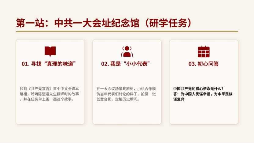 线上版本:指尖上的Citywalk——在“跟着档案观上海”数字人文平台上寻访《新青年》编辑部旧址等红色初心地标;线下版本:参观上海市档案馆《党从这里诞生》展览并前往中共一大纪念馆等场地参观学习。