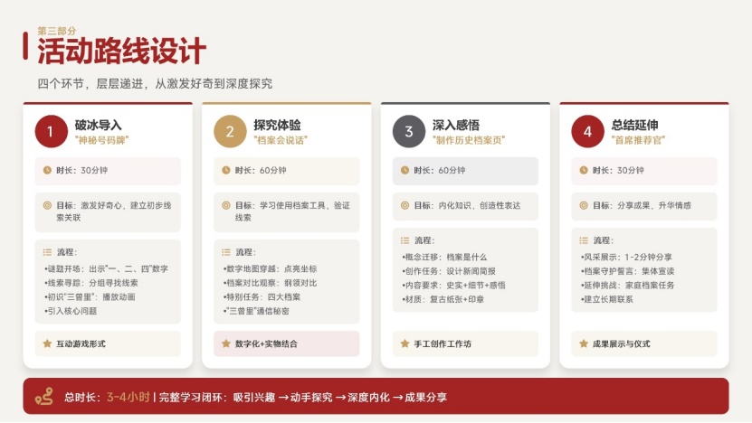 引导同学设计互动体验,例如:准备导览手册内含研学路线和档案故事,真人现场讲解+数字平台互动交互体验,讲解过程中穿插趣味档案小故事和有奖互动问答,拍照打卡生成个性化研学地图等。